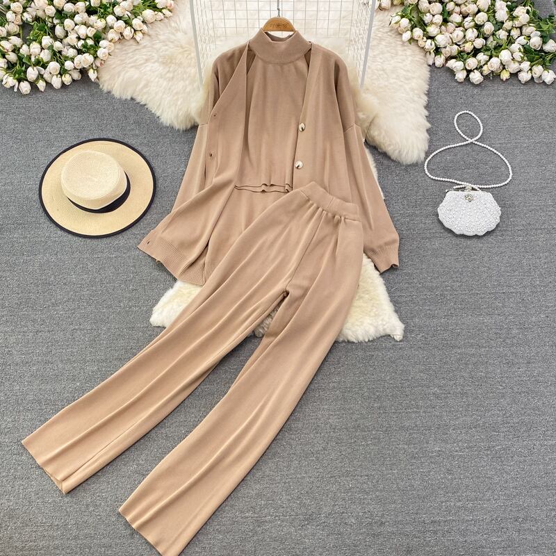 女性トラックスーツシックな 3 点セット ニット 無地ラウンジ スーツ カーディガン セーター + ジョガー パンツ + ノースリーブ タンクトップ ソリッドカラー Abe73043919731