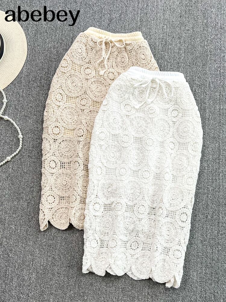 2022中空無地弾性ウエストかぎ針編みスカートドローストリング女性 エラスティック 伸縮 ソリッドカラー Abe79992922438