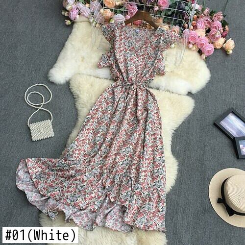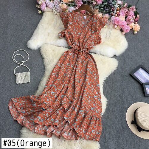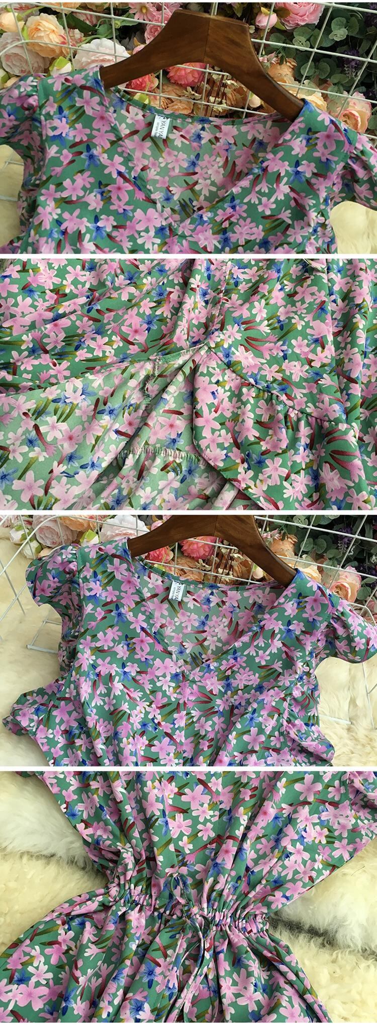 2022 春秋フレンチ V ネック半袖ドレスフリルハイウエスト包帯花柄不規則なミッドロング A ラインドレス ハイウェスト ショート ハーフスリーブ ラッフル スプリング 春物 オータム 秋物 Vネック Aライン Abe22042196274