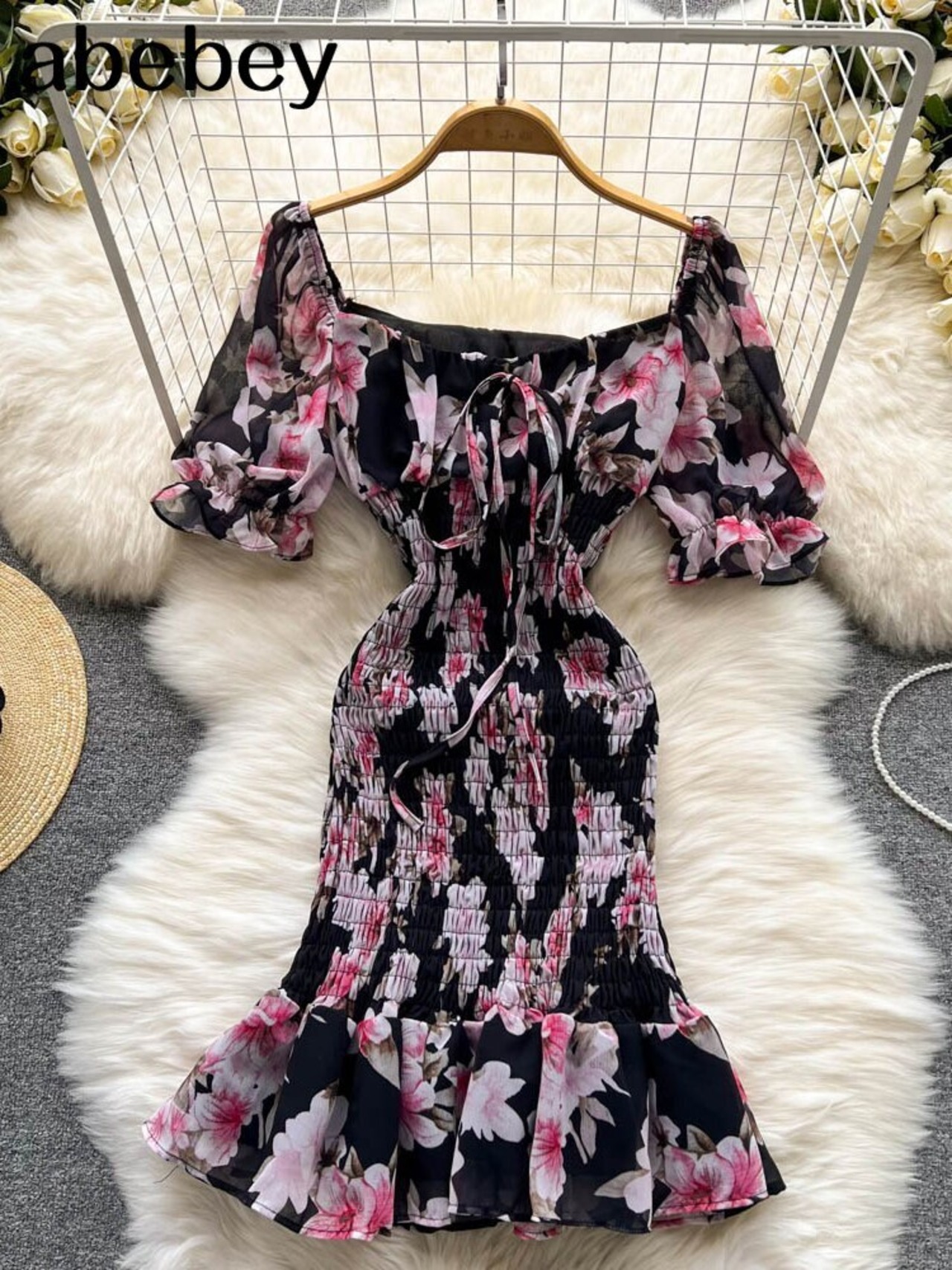 2022 夏シャーリングストレッチ女性ミディシースドレスボディコンセクシーなスクエアカラーローズ花柄パーティー Vestidos サマー 夏物 スクウェア Abe14536646032
