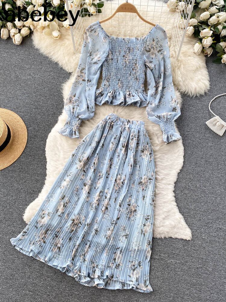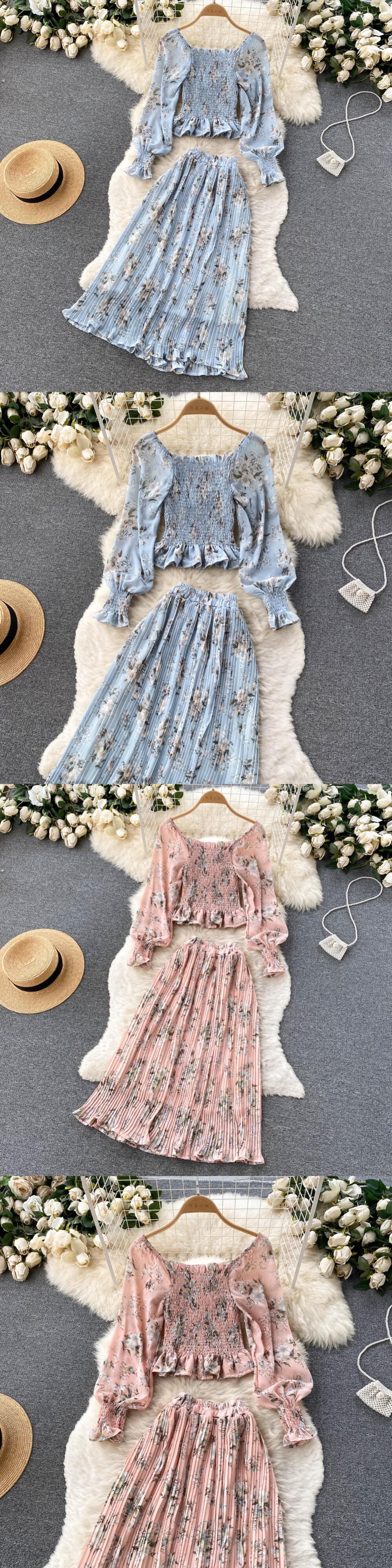 女性プリント シフォン 2 点セット スクエア カラー ランタン スリーブ ブラウス + ウエスト プリーツ スカート スーツ衣装 ランタンスリーブ スクウェア Abe59263191537
