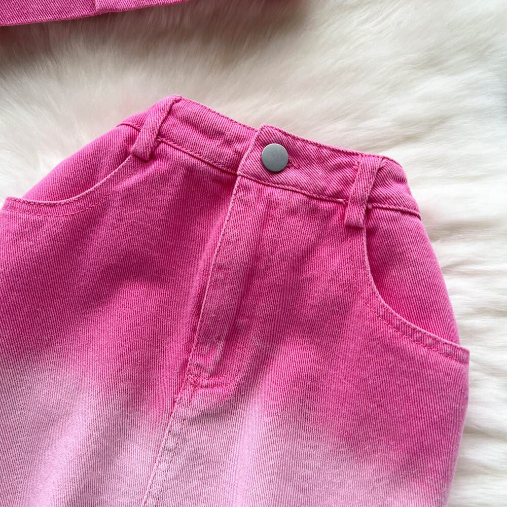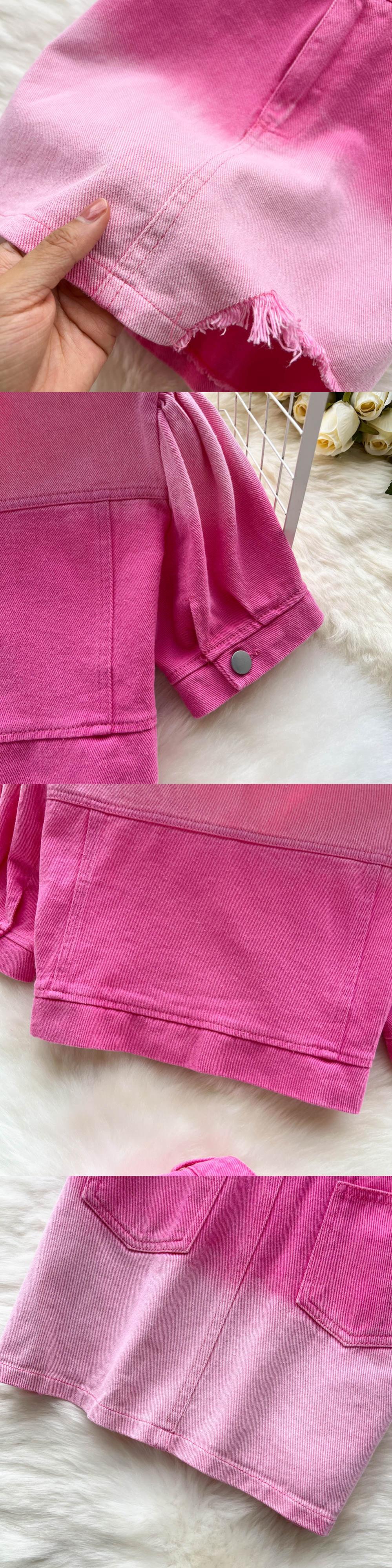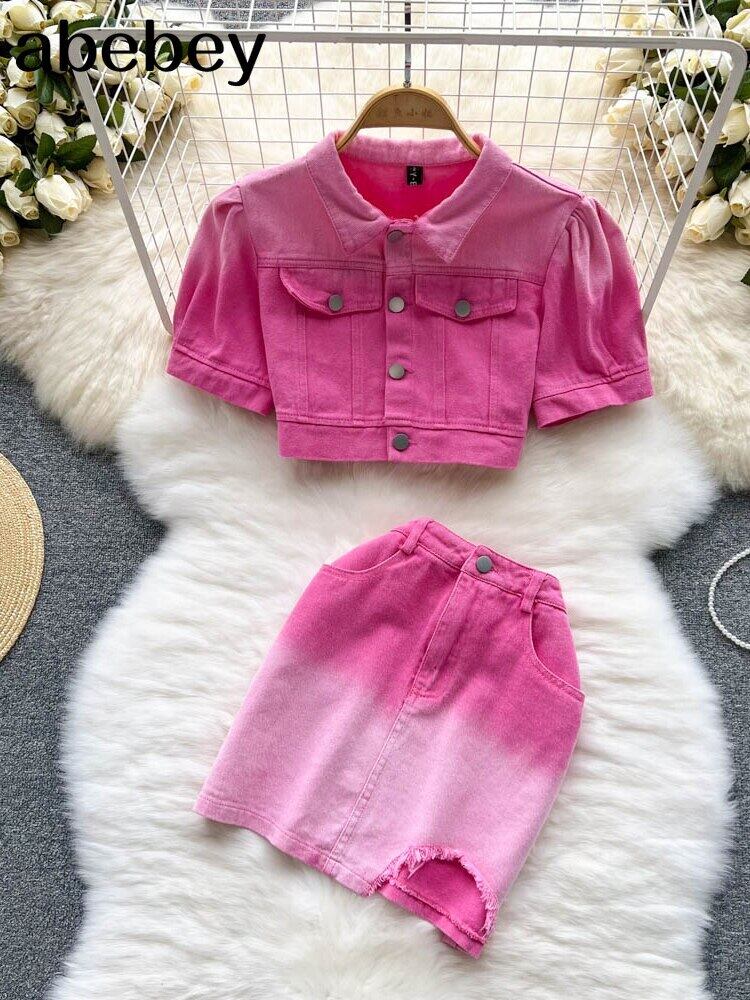 2022 デニムピンクのセクシーな女性セットグラデーションボタンポケット半袖クロップトップデニムスカートツーピースセット衣装 ショート ハーフスリーブ Abe21527479991