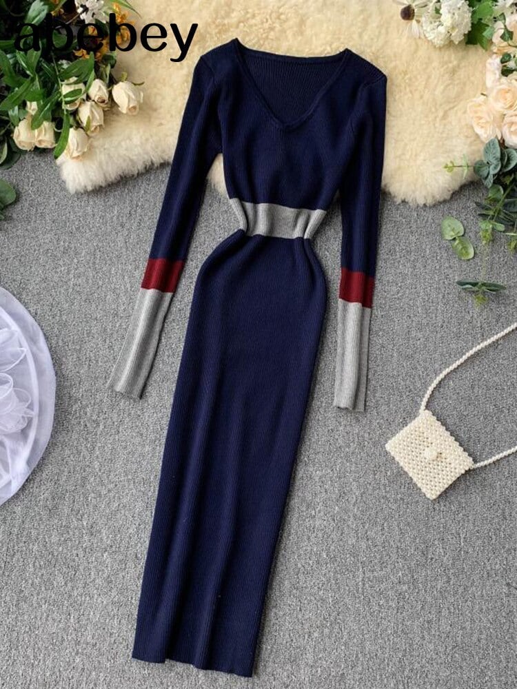 女性秋冬セータードレスパッチワーク V ネックスリム弾性ドレス暖かいボディコンプルオーバーニットドレス エラスティック 伸縮 オータム 秋物 ウィンター 冬物 Vネック Abe13360129820