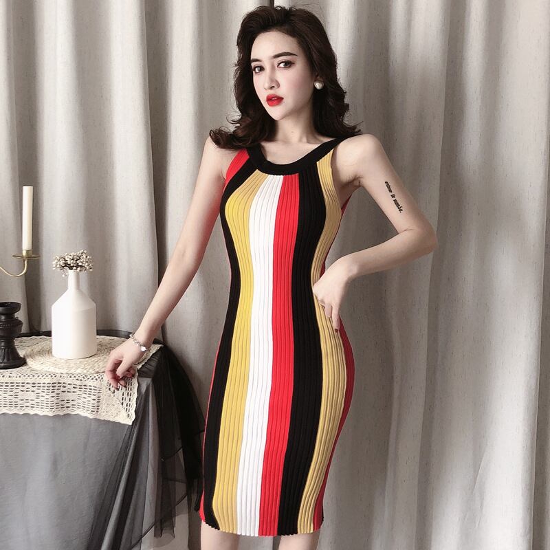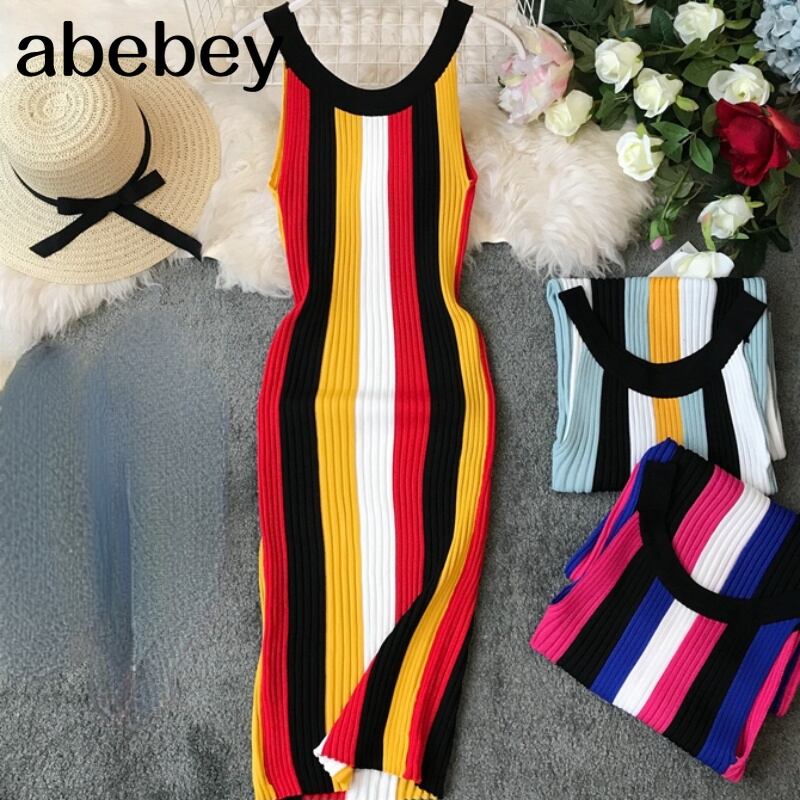 夏 2022 ラウンドネックレインボー縦ストライプの女性のセクシーなニットドレスノースリーブプルオーバー Vestido サマー 夏物 Oネック Abe11293943308
