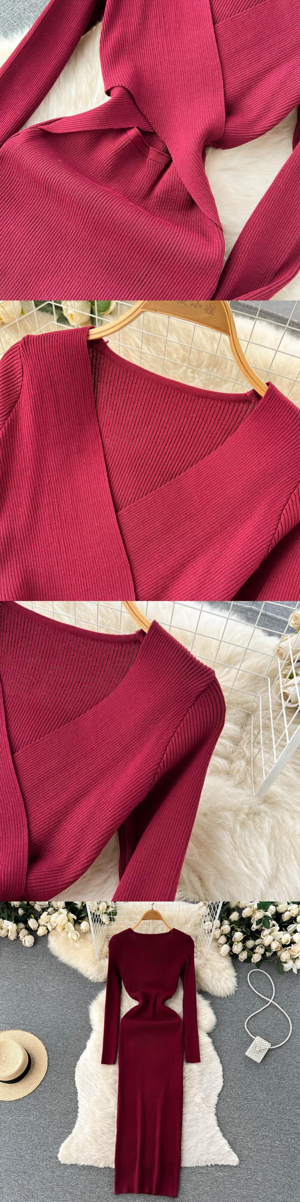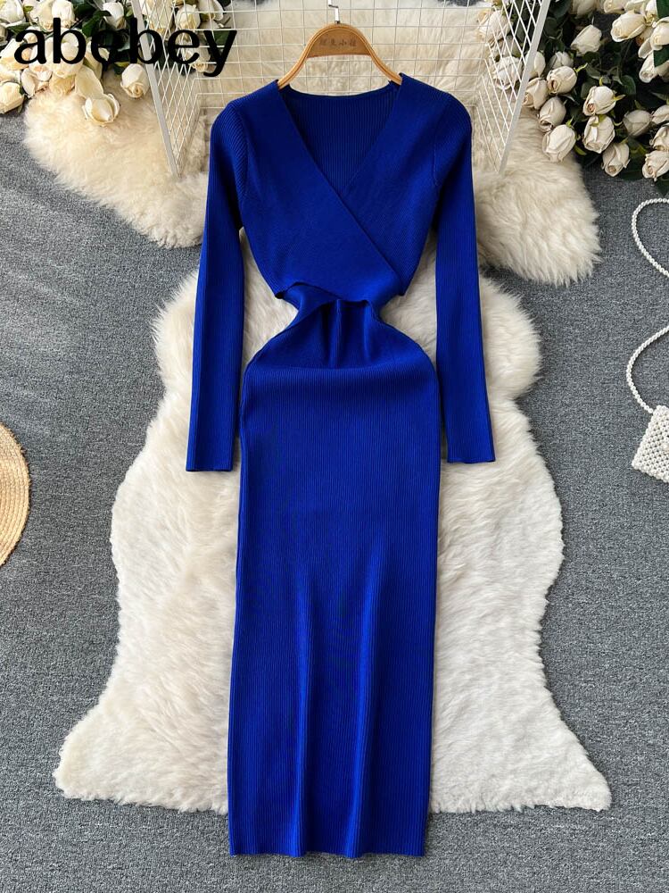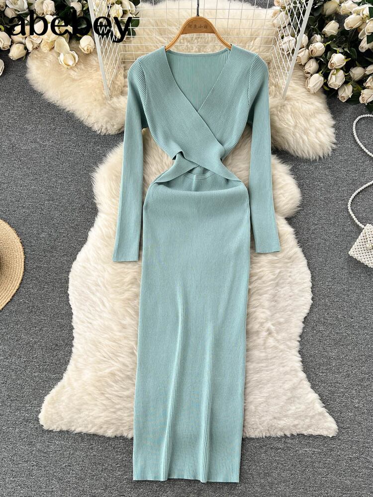 フランスの秋のセクシーなニットドレスの女性の V ネック長袖スリムドレス秋中空アウトセーターロングドレス 2022 オータム 秋物 Vネック Abe80983333770