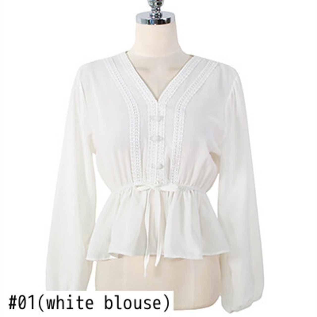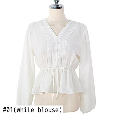 V ネック白ブラウスサッシ女性服 2022 秋レース長袖シャツ女性ブラウスシャツ Chemisier ロング ホワイト Vネック Abe22296788065