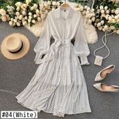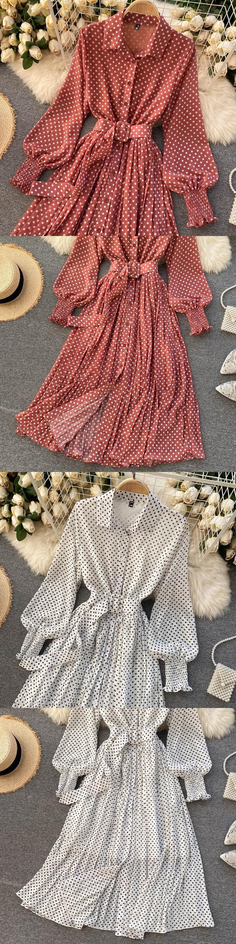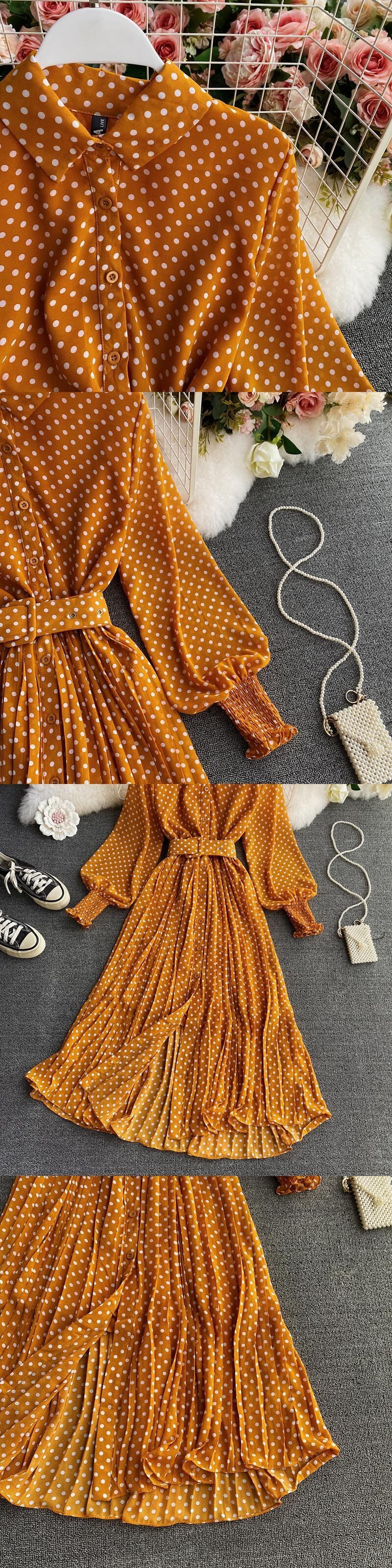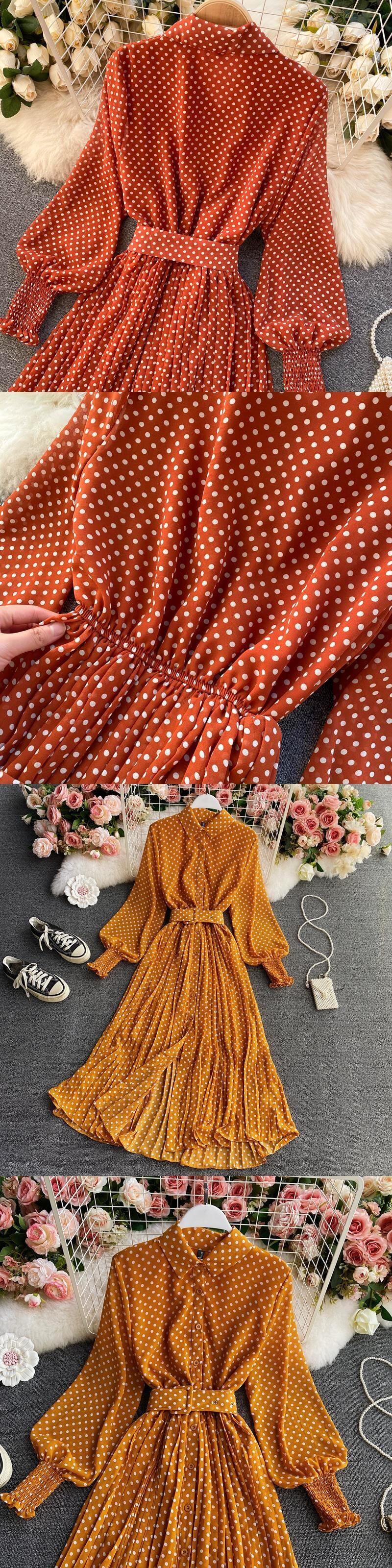 春と夏のフレンチマキシドレス 2022 サンドレス長袖オレンジ水玉シフォンプリーツドレスローブ ロング スプリング 春物 サマー 夏物 Abe77273462118