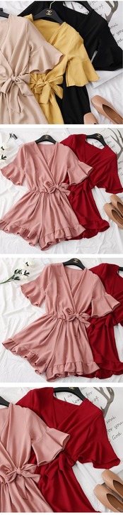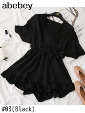 女性ロンパースカジュアルワイドレッグパンツオーバーオール半袖 v ネックソリッドロンパース夏のビーチシフォンフリルジャンプスーツ ショート ハーフスリーブ サマー 夏物 Vネック ワイドパンツ ソリッドカラー Abe98291537782