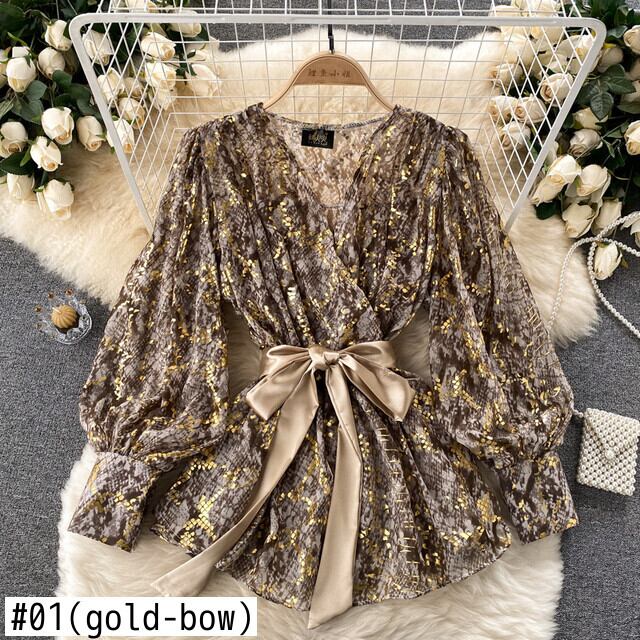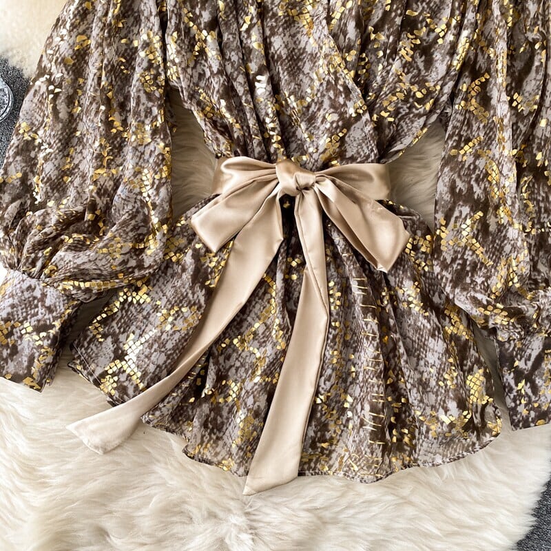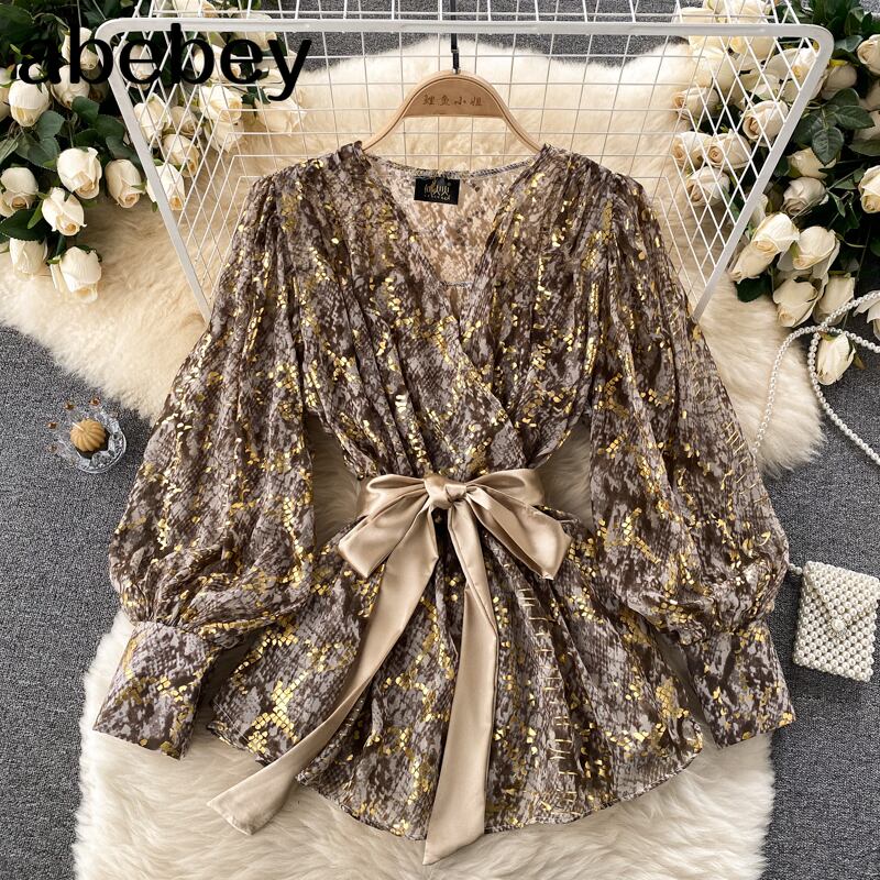 女性のレトロなスネークプリントブラウス長袖 V ネックサッシトップス秋のルーズストリートブラウス ロング オータム 秋物 Vネック Abe25121045354