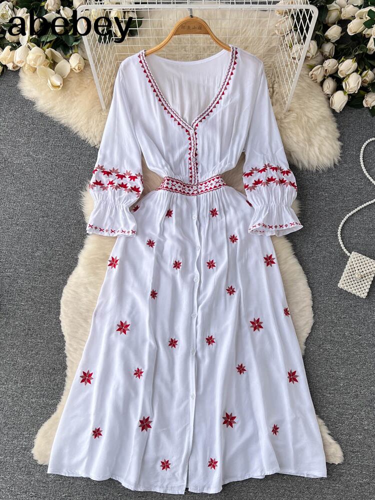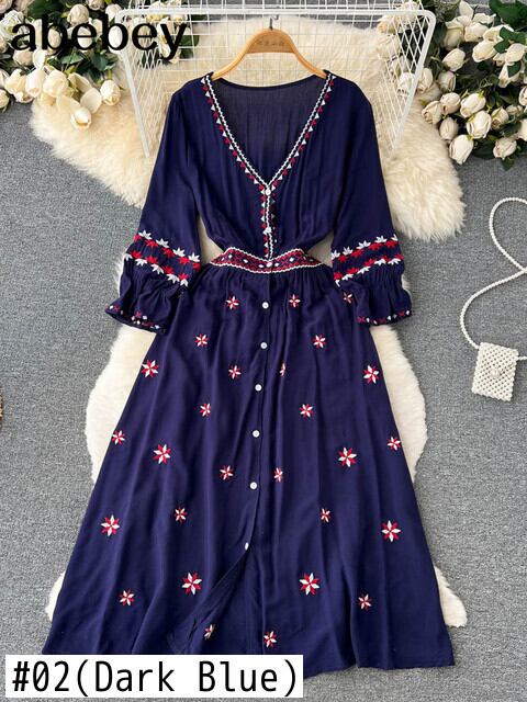 女性フローラル Emberoidery ビーチボヘミアンマキシドレス V ネックランタンスリーブ秋のドレス Vestidos オータム 秋物 花柄 Vネック Abe60784169599
