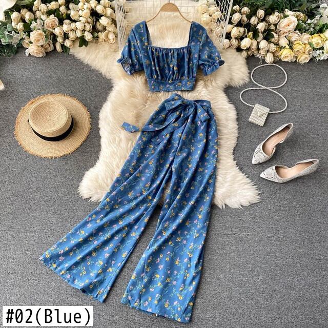 女性秋フレンチ自由奔放に生きる花柄スーツスクエアカラーパフスリーブショートトップス + ウエストワイドレッグパンツ 2 枚セット オータム 秋物 ワイドパンツ スクウェア Abe81064108626