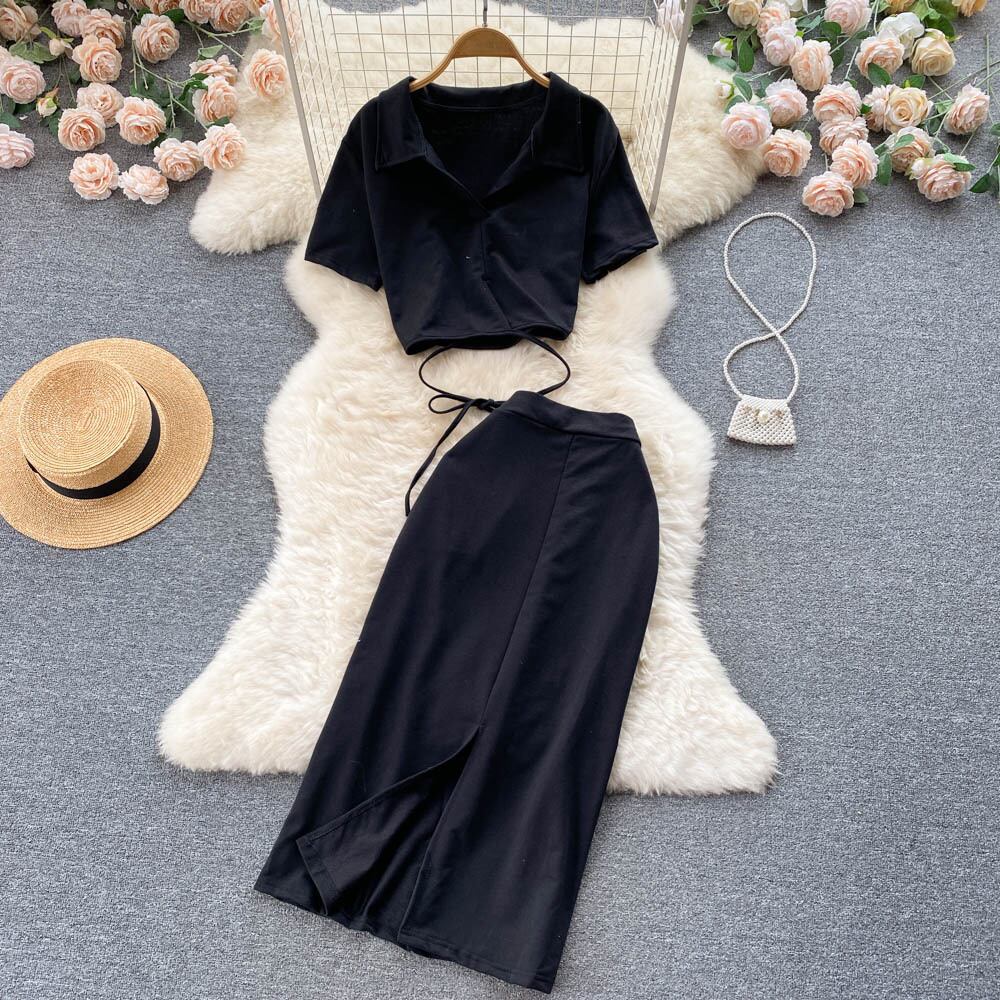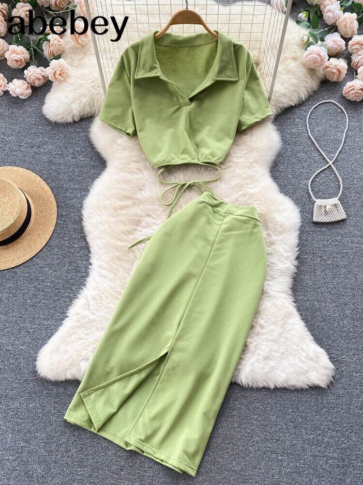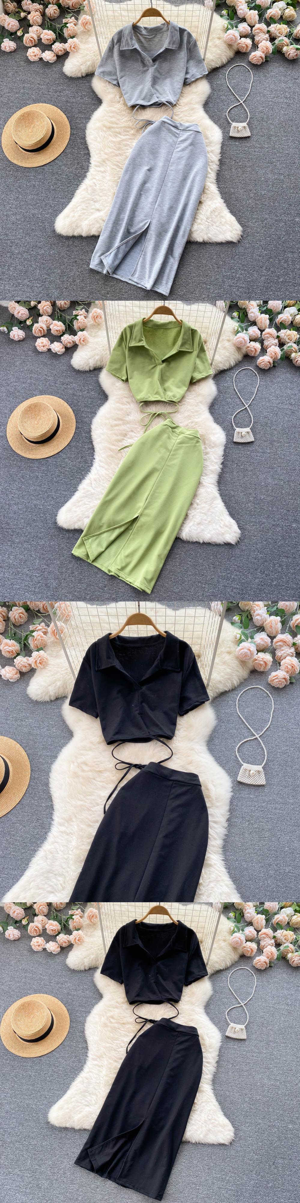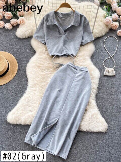 女性のセクシーなツーピースの服セット女性のスーツ無地半袖トップとウエストスプリットロングスリットスカート夏 outfis ショート ハーフスリーブ サマー 夏物 ソリッドカラー Abe58316757014