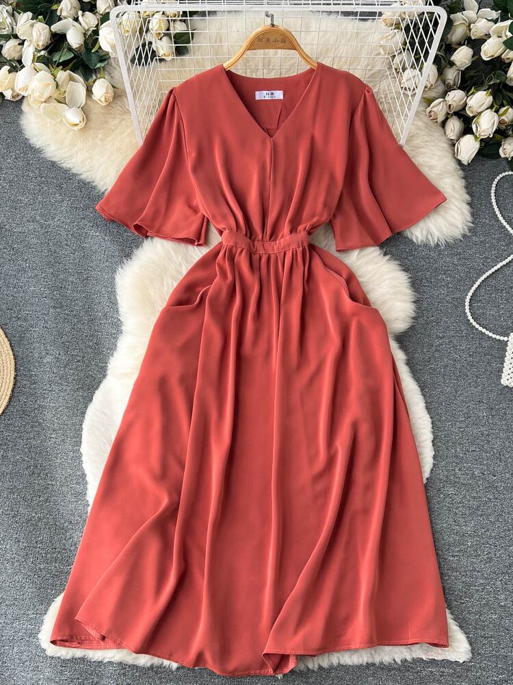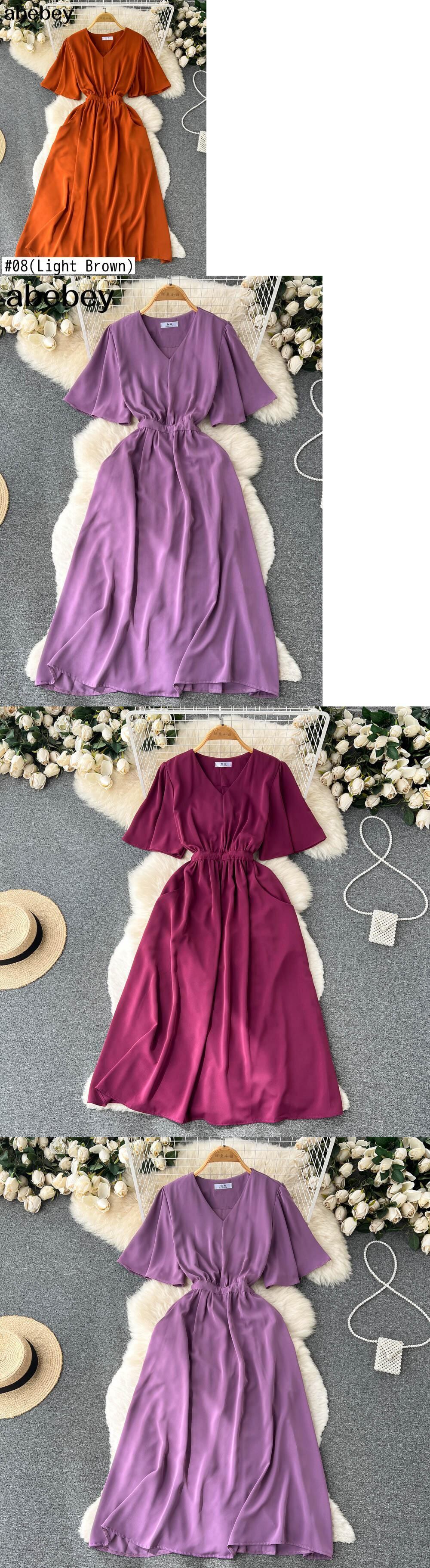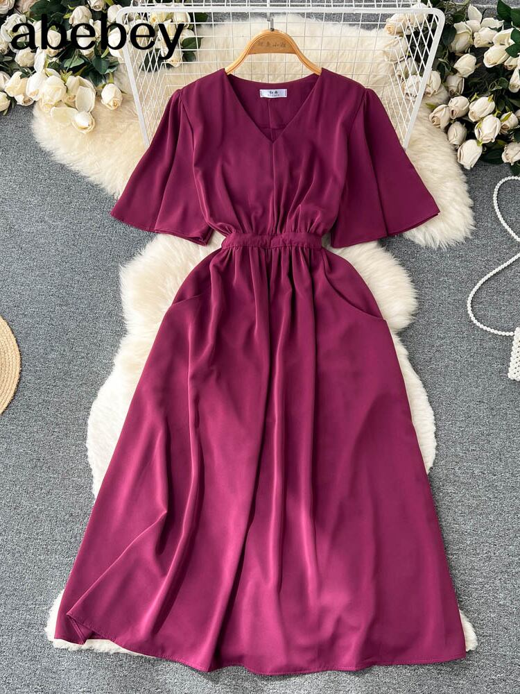 夏の女性のドレス V ネック ショート フレア スリーブ ウエスト A ライン ポケット Vestidos フレアスリーブ サマー 夏物 Vネック Aライン Abe61764232205