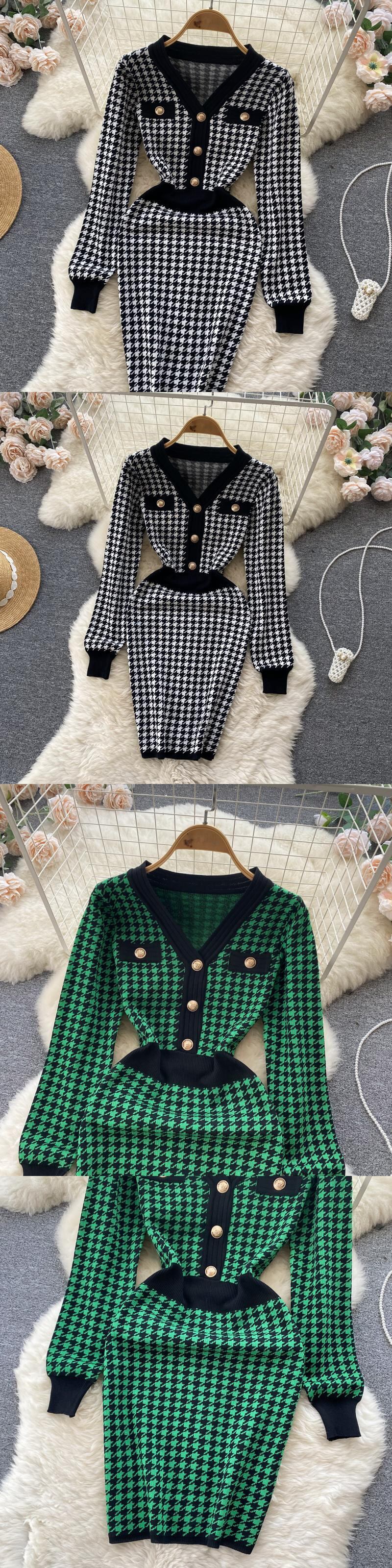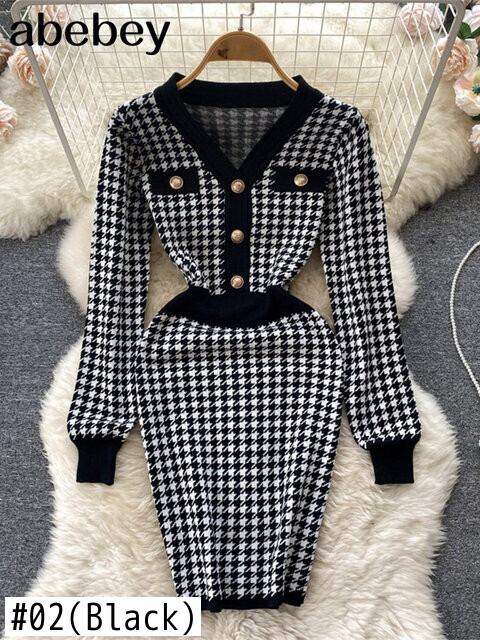 女性ニットドレス長袖 V ネック弾性スリムペンシルドレス 2022 秋のセクシーなボディコンボタンセータードレス ロング エラスティック 伸縮 オータム 秋物 Vネック Abe52121738455