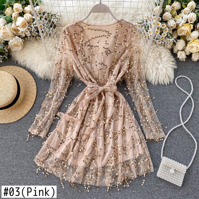 メッシュショートドレス女性 V ネック長袖レースアップ A ラインドレス秋のセクシーなスパンコールパーティードレス ロング オータム 秋物 Vネック Aライン Abe67595934789