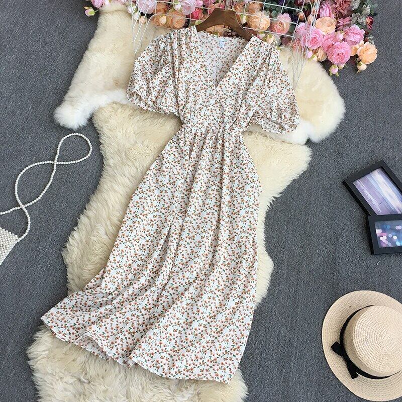 2022 春秋フレンチ V ネック半袖ドレス ハイウエスト プリーツ ウエスト花柄プリント ミッドレングス A ライン ドレス ハイウェスト ショート ハーフスリーブ スプリング 春物 オータム 秋物 Vネック Aライン Abe34650031886