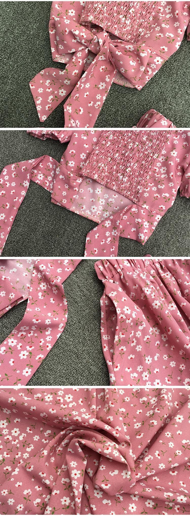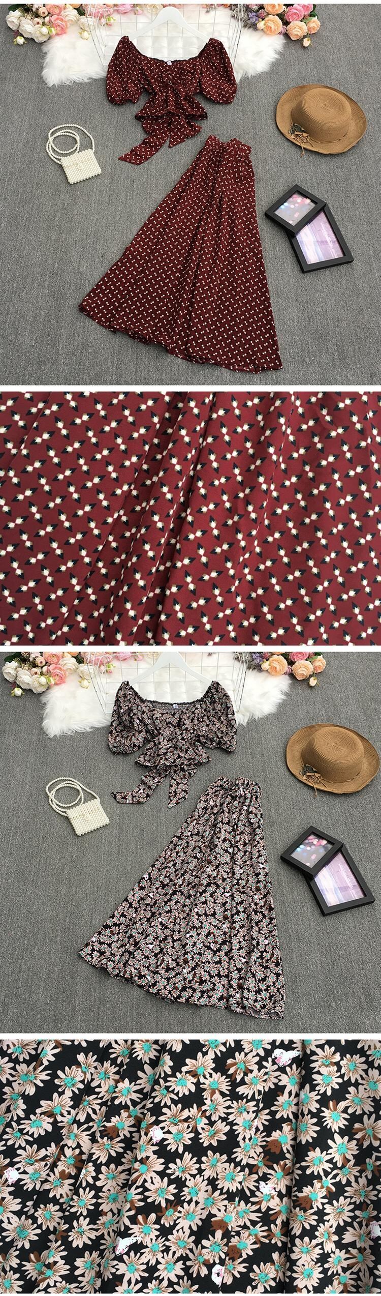 2022年夏Vネックパフスリーブショートシャツトップス+ハイウエストプリーツウエスト花柄スカート2点セット ハイウェスト サマー 夏物 Abe79108185300