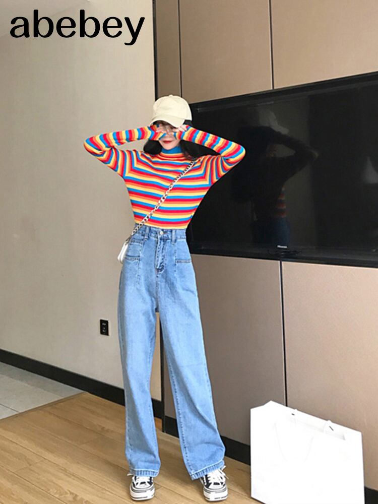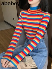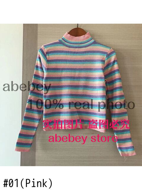 冬のレインボー ニット女性セーターと長袖 O ネック プルオーバー セーター トップス ストライプ タートルネック ジャンパー ロング ウィンター 冬物 Oネック Abe28728218936