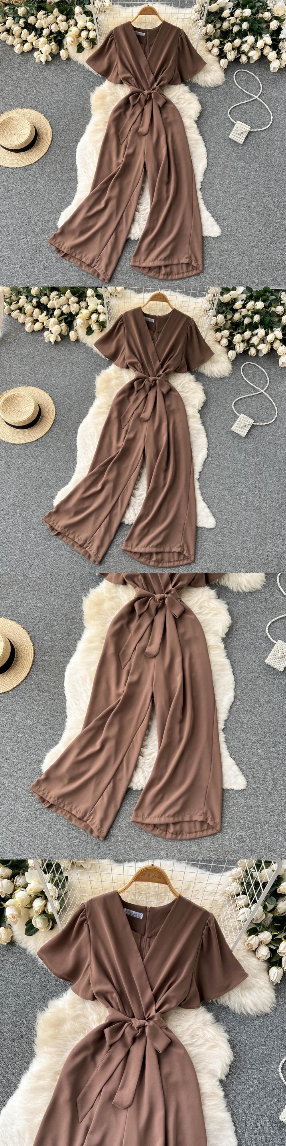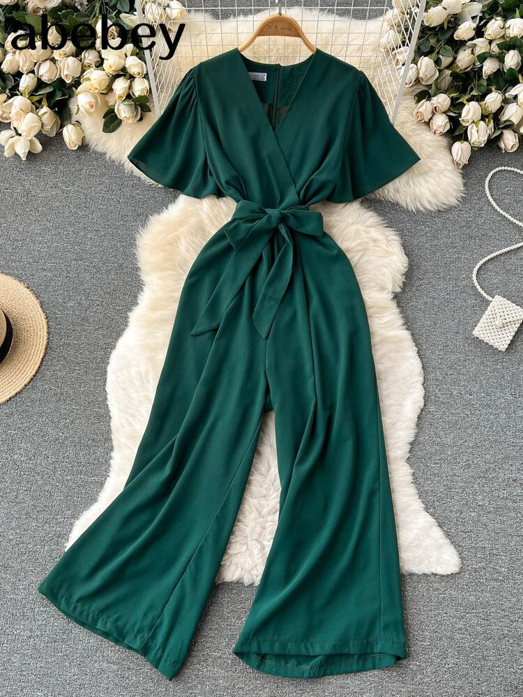 2022 V ネックジャンプスーツ夏不規則なロンパース女性ワイド脚夏オーバーオール女性 サマー 夏物 Vネック ワイドレッグ ワイドパンツ Abe40292588682