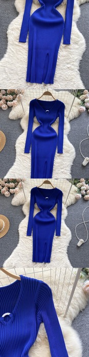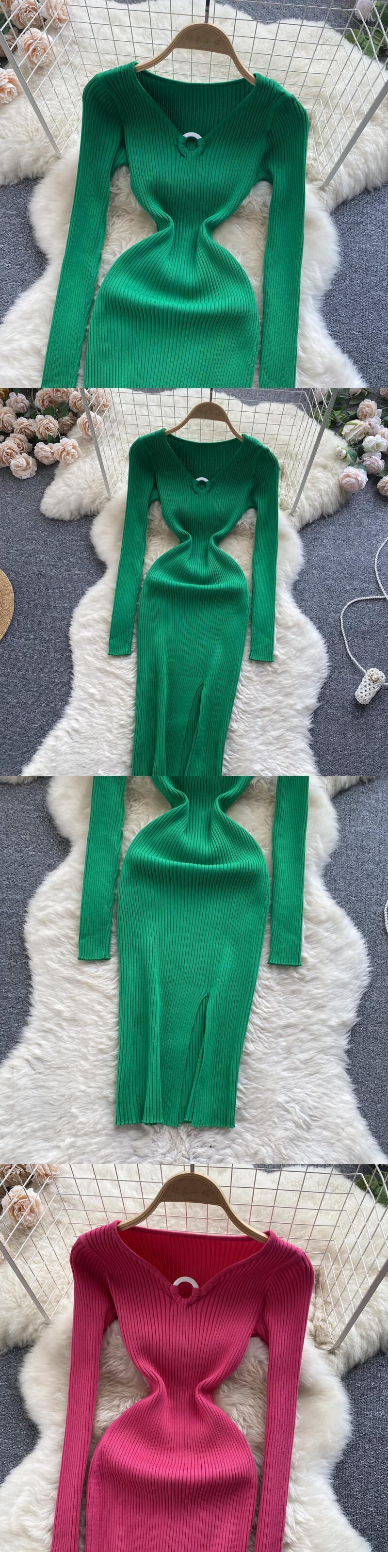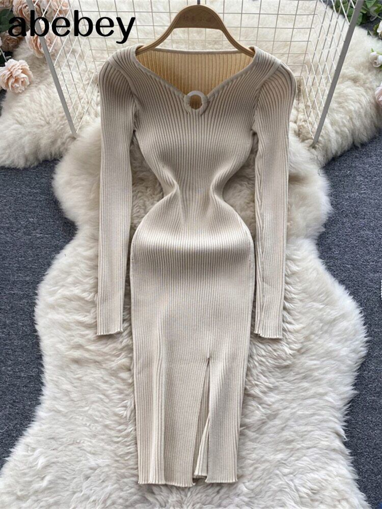 シニア女性ニットドレス長袖 V ネック弾性スリムペンシルドレス 2022 秋のセクシーなボディコンスプリットセータードレス ロング エラスティック 伸縮 オータム 秋物 Vネック Abe33749097081