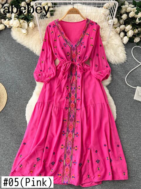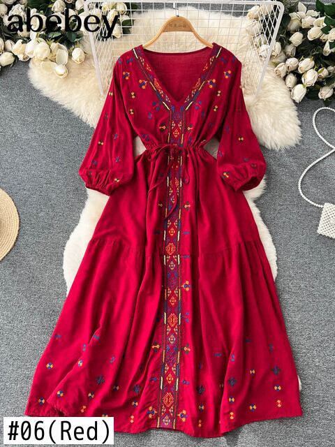 ボヘミアンレトロ刺繍ロングドレス V ネックラフスリーブシースドレス 2022 エスニックタイウエストサマードレス 夏物 Vネック Abe25646819674