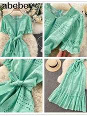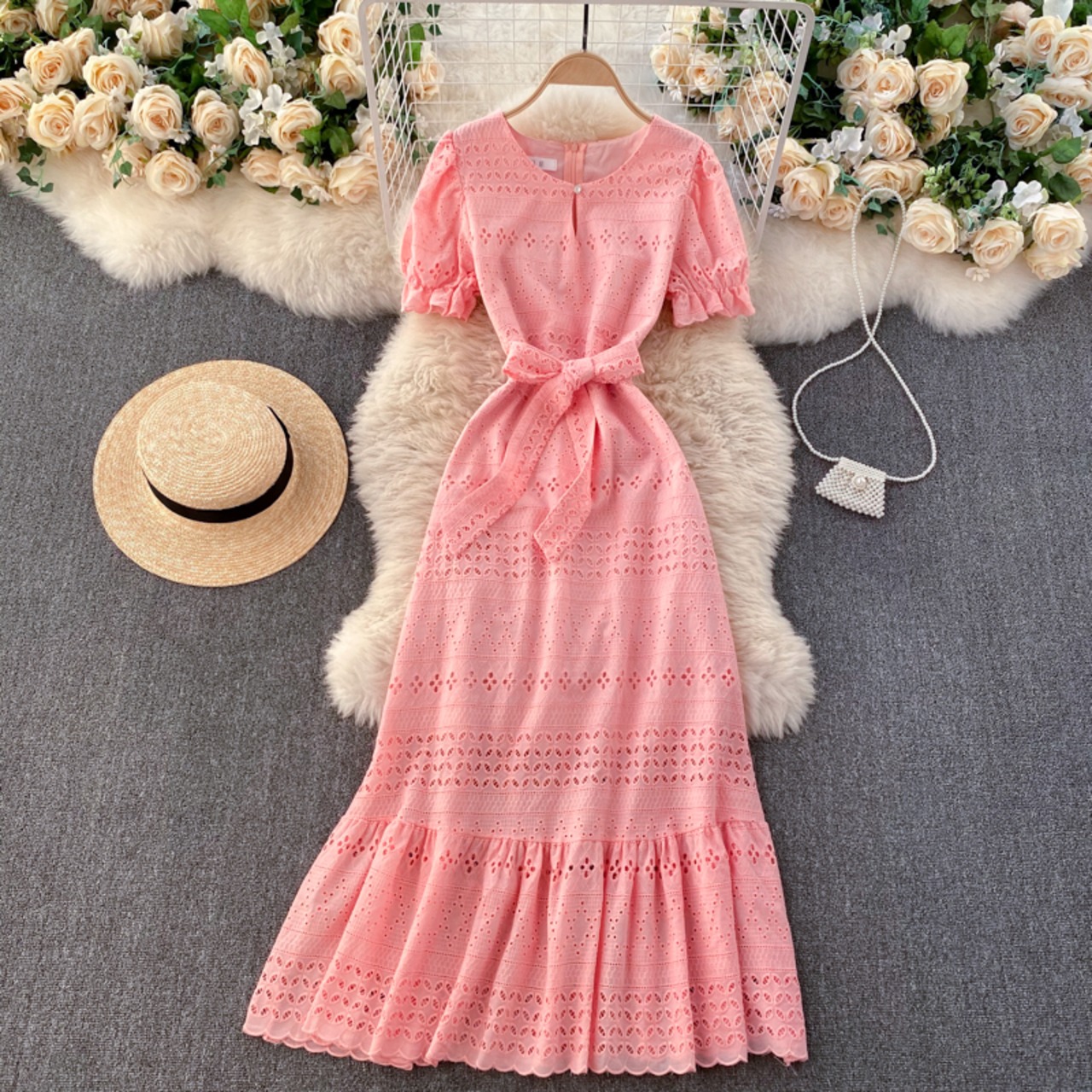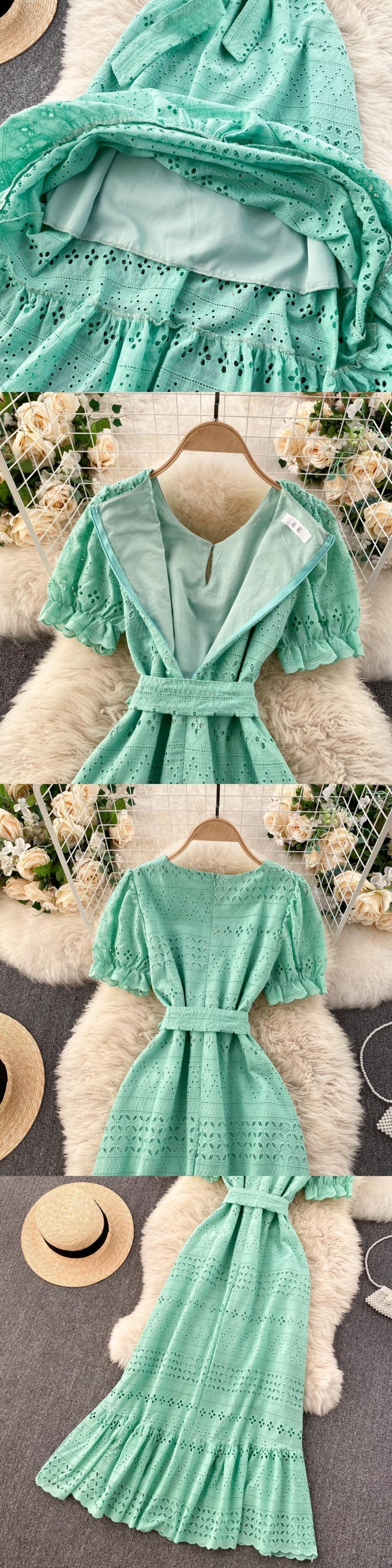 フレンチ中空フリルドレス女性 O ネックパフスリーブレースアップソリッド A ラインドレス夏のストリートミディドレス ラッフル サマー 夏物 Oネック Aライン ソリッドカラー Abe77805622057