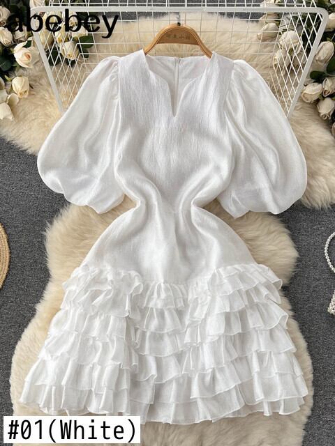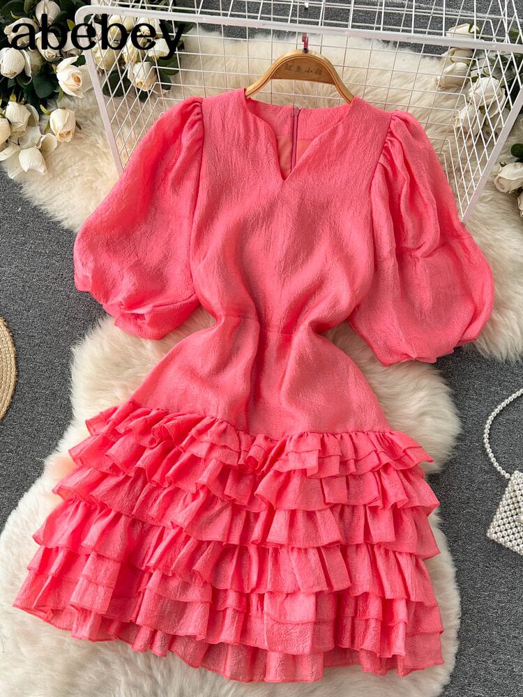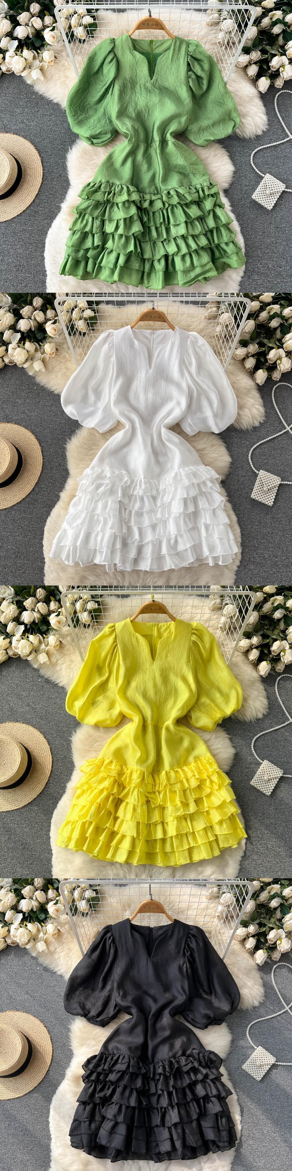 グリーン/ピンク シックなミディ ドレス女性ソリッド フリル パフ スリーブ ドレス 2022 フリル Vestidos ラッフル ソリッドカラー Abe47420383876