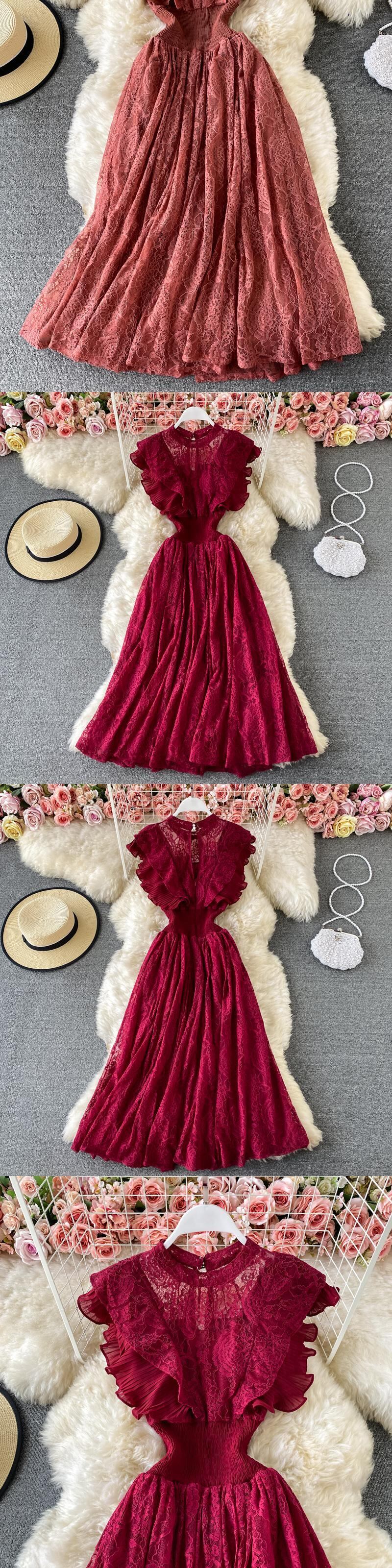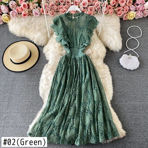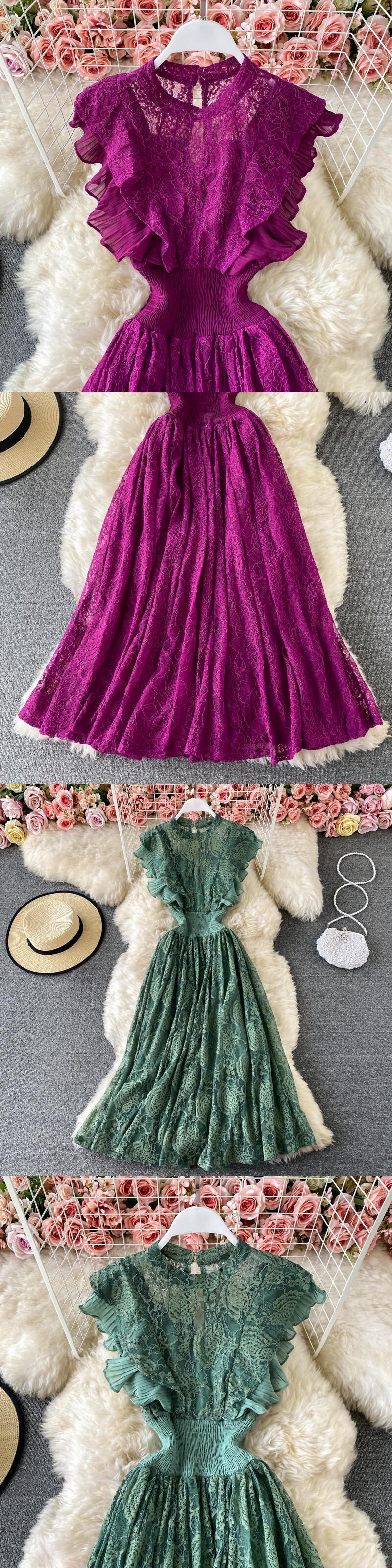 パープル/グリーン/レッドレースミディドレス女性スウィートラウンドネックフリル Vestidos ウエストスリムローブ春秋 2022 大人ガーリー キュート カジュアル スプリング 春物 オータム 秋物 Oネック Abe40353954456