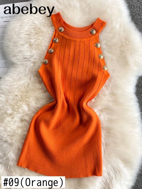 2022 夏中空アウトレディースタンクトップ薄型ニットノースリーブセクシーなトップスゴールデンボタンキャミソール女性服 サマー 夏物 Abe82780197097