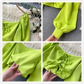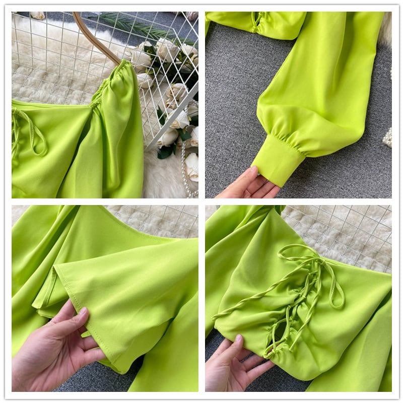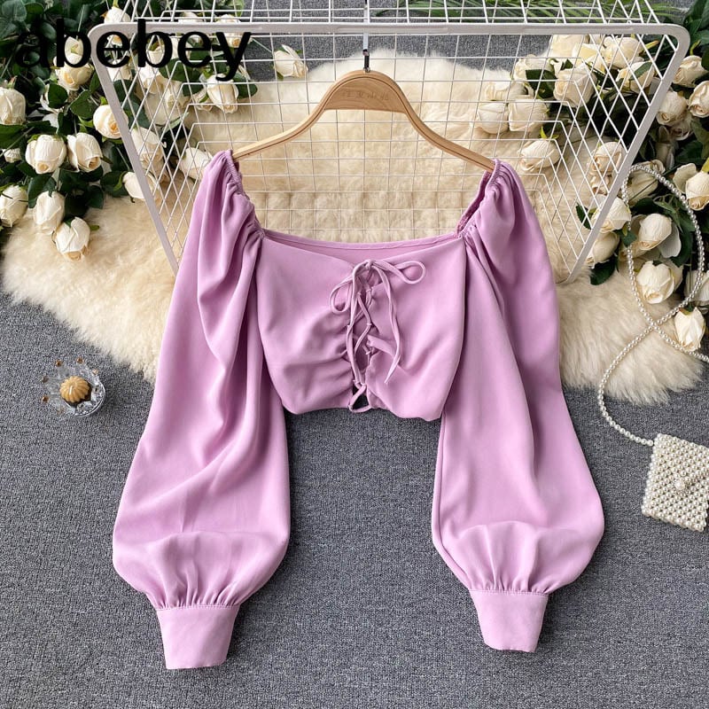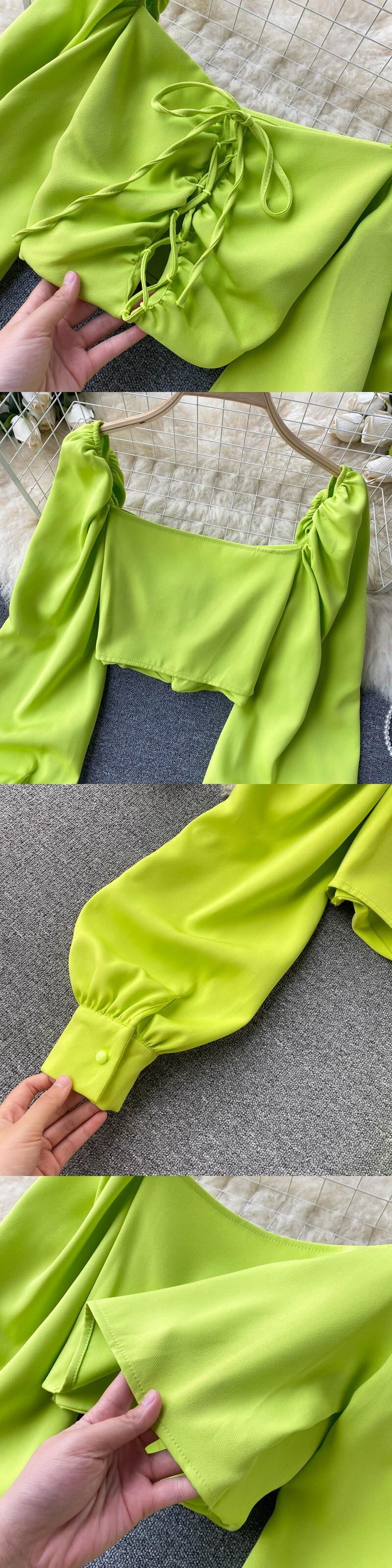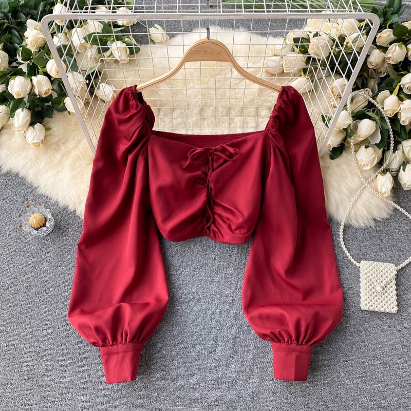 女性ブラウススクエアカラーロングパフスリーブ無地スリムトップス 2022 秋の休暇ショートブラウス オータム 秋物 ソリッドカラー スクウェア Abe97037565526