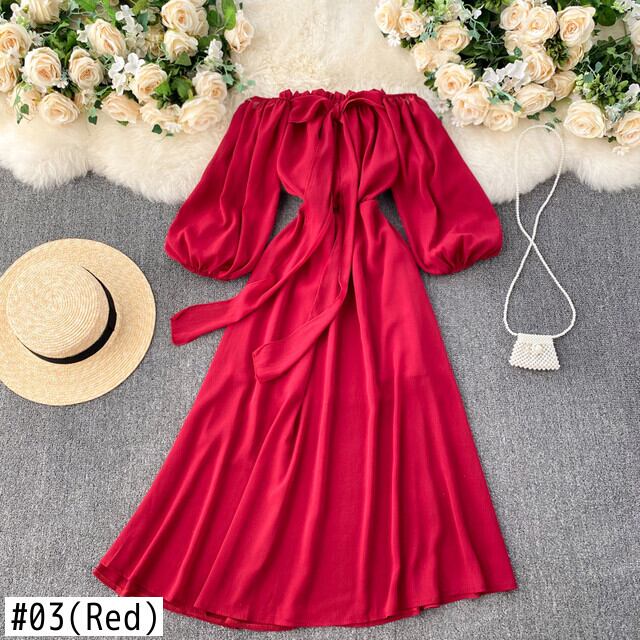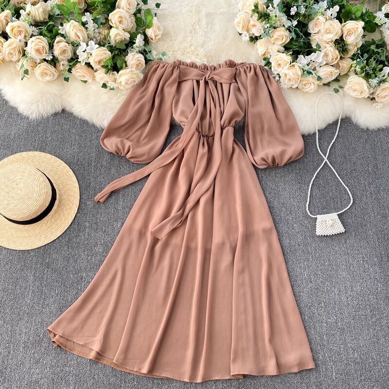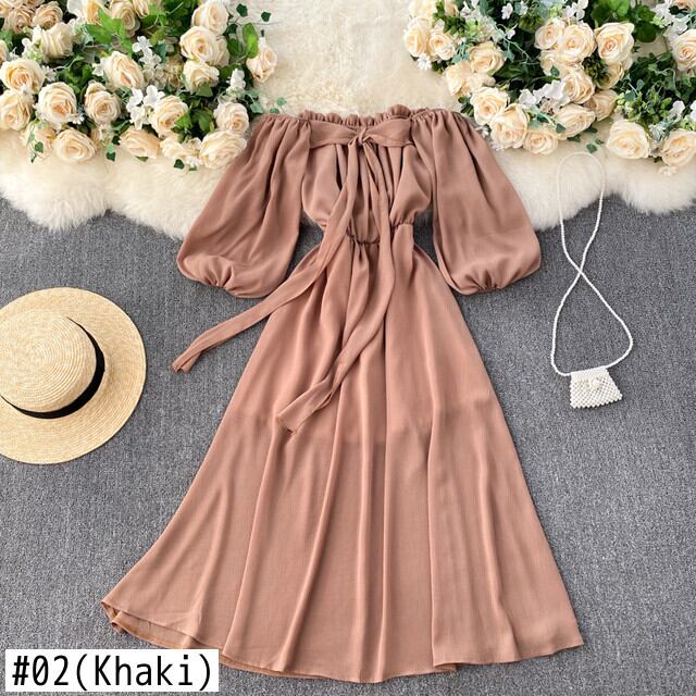 フランスのオフショルダーの女性ドレス夏セクシーなスラッシュネックパフスリーブ A ラインドレスロマンチックな休日のビーチミディドレス サマー 夏物 Aライン Abe68222411502