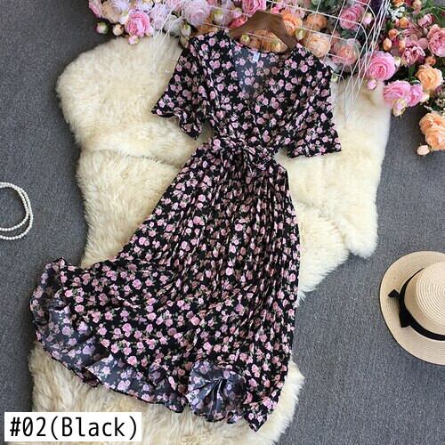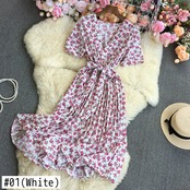2022 春秋フレンチ V ネック半袖ドレス ハイウエスト包帯ウエスト花柄プリント ミッドレングス A ライン ドレス ハイウェスト ショート ハーフスリーブ スプリング 春物 オータム 秋物 Vネック Aライン Abe33654311345