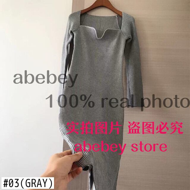 2022 春と冬の新しいスクエアカラーフレアスリーブニットセクシーなスリムプルオーバーロングニットドレス女性 WK39101L スプリング 春物 ウィンター 冬物 Abe2340701778