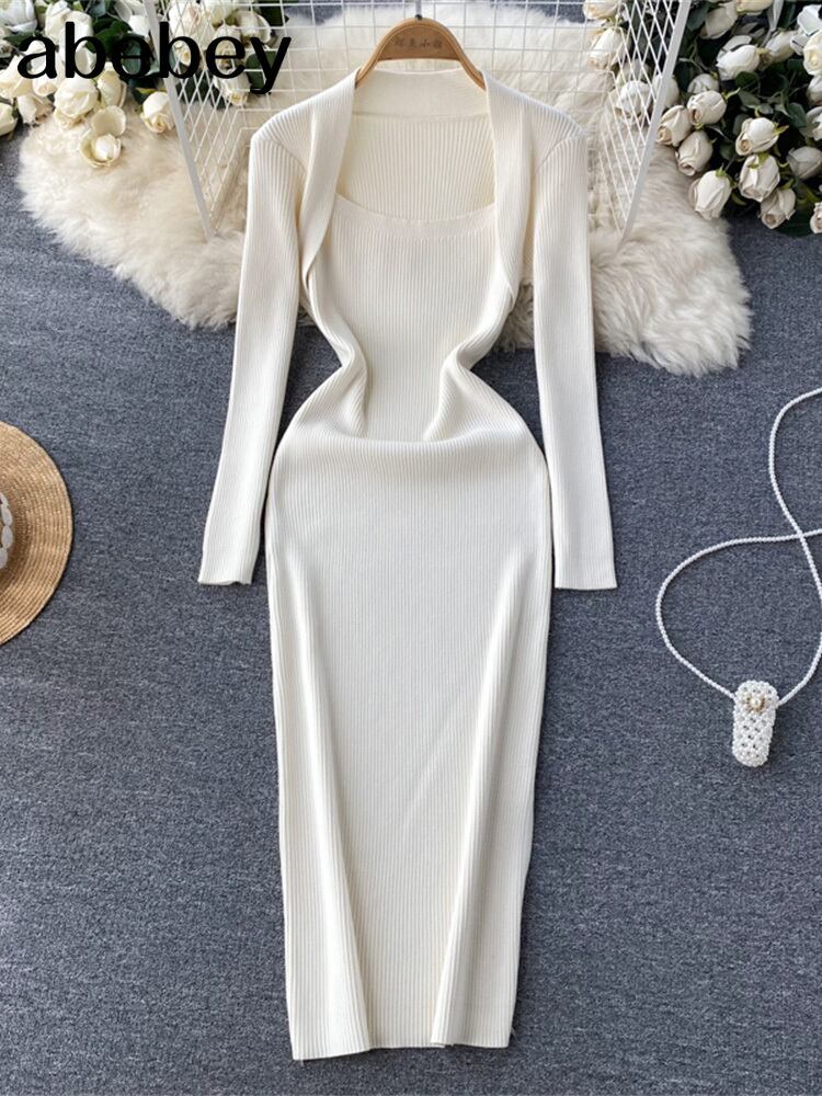 女性スプリットニットロングドレス秋の長袖ミディウォームドレス 2022 フレンチスタイルボディコンセータードレス オータム 秋物 Abe75220956799