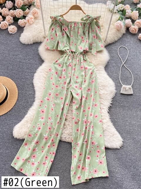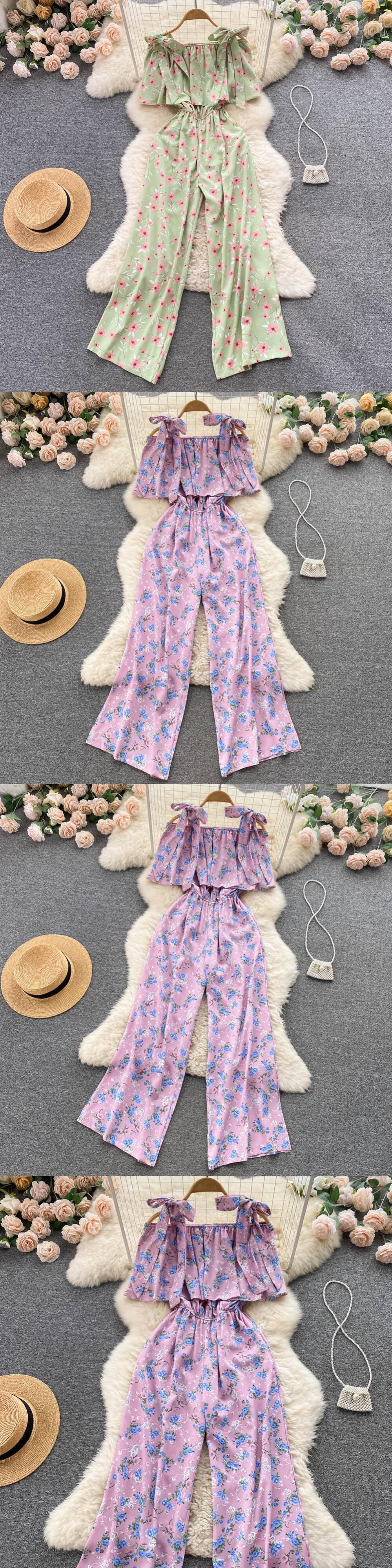 女性ジャンプスーツロンパース夏花柄オフショルダーフリルレースアップワイドレッグホリデールーズジャンプスーツ ラッフル サマー 夏物 ワイドパンツ Abe42234755116