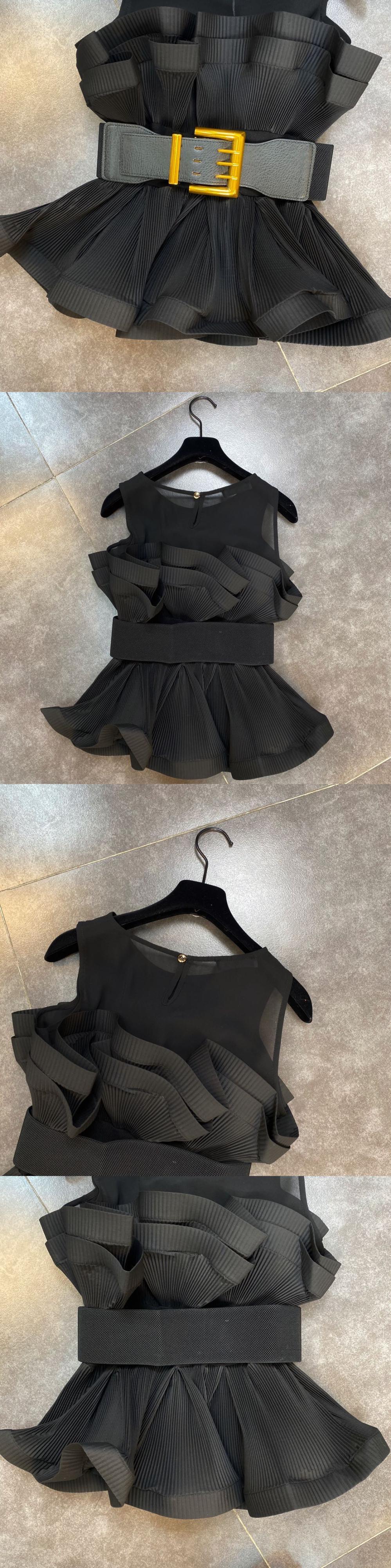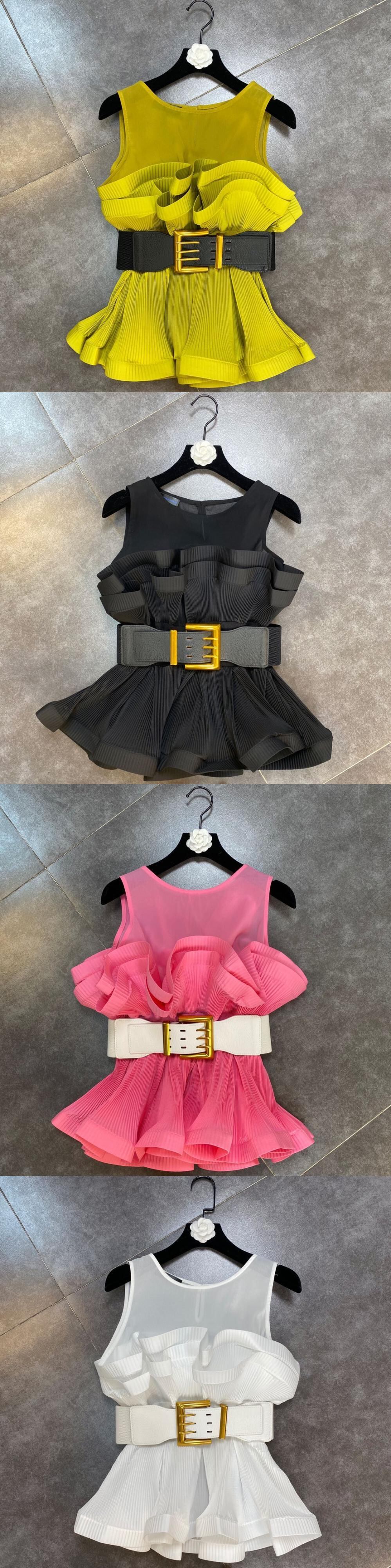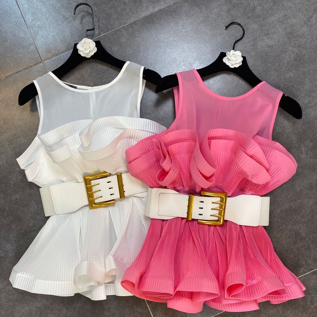 2022 夏ノースリーブ O ネック フリル ショート スリム ブラウス ベルト付き女性ストリート潮 ラッフル サマー 夏物 ハーネス Oネック Abe46520890108