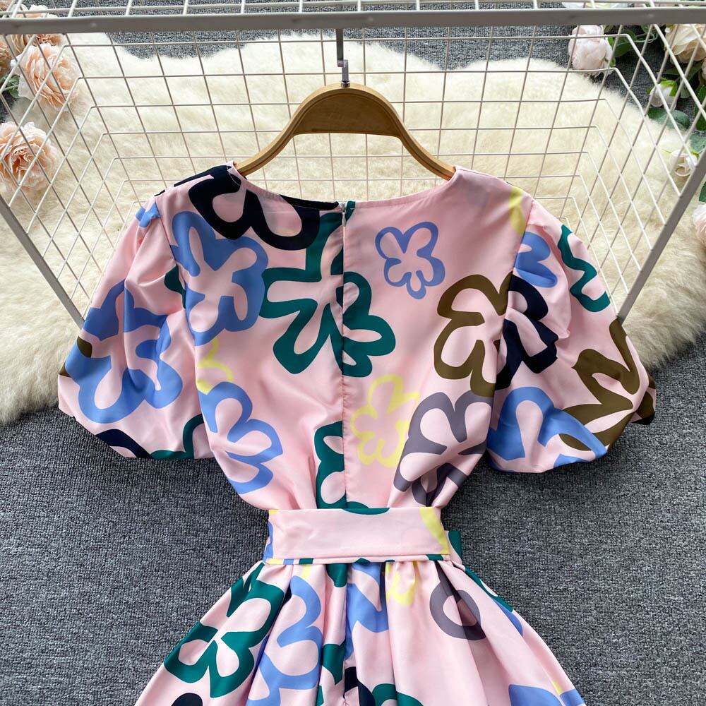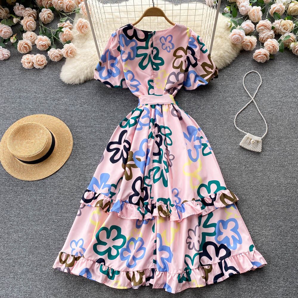 女性の自由奔放に生きるパフスリーブロングドレス夏ゆるい花柄プリント半袖ドレスパーティーマキシドレス Vestidos ショート サマー 夏物 Abe73622656109