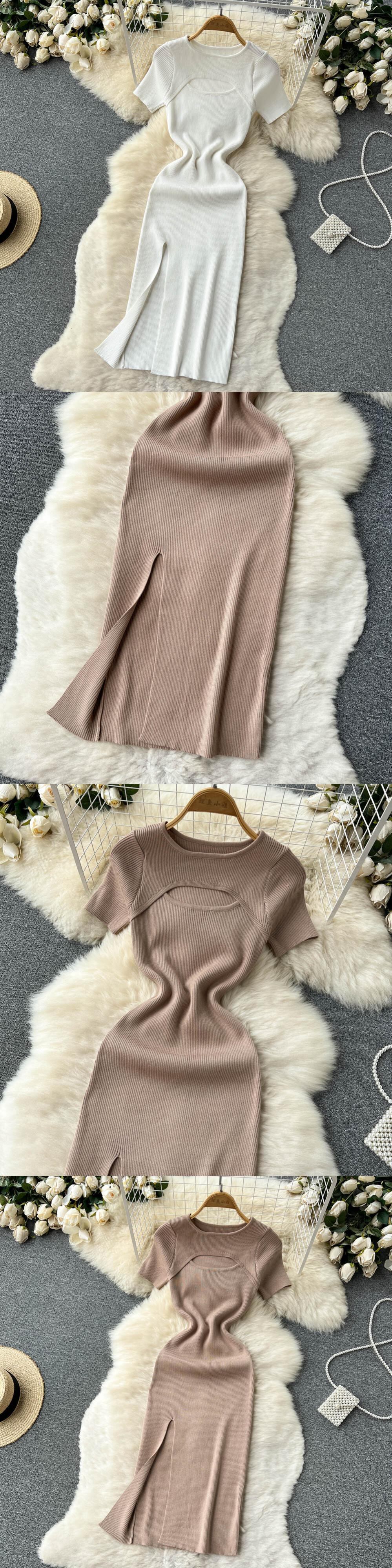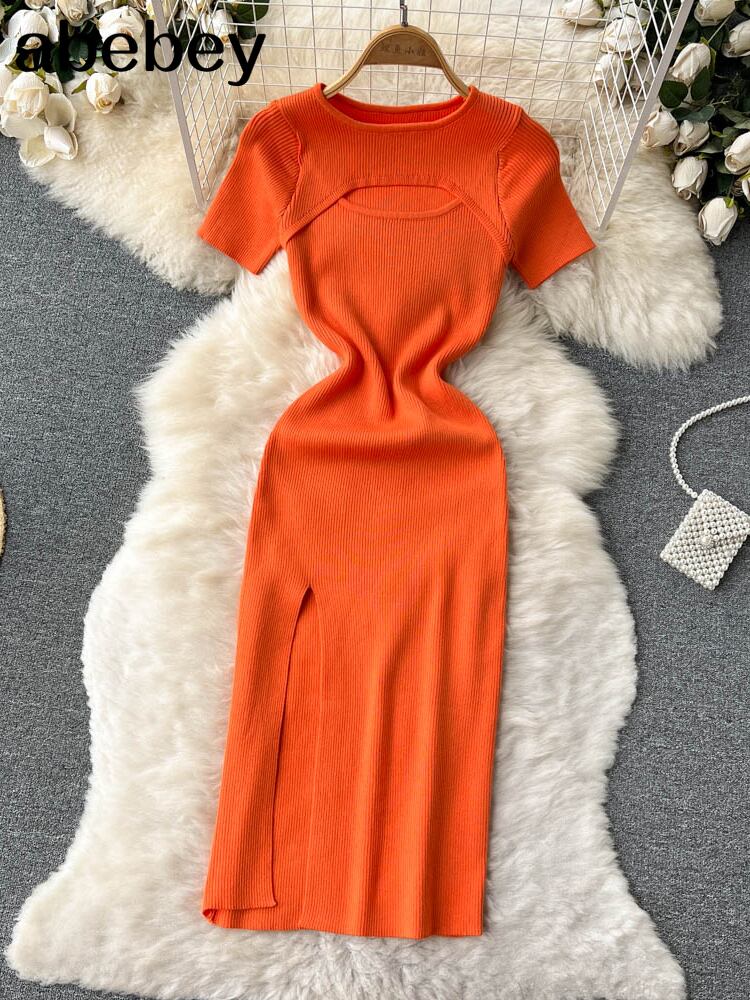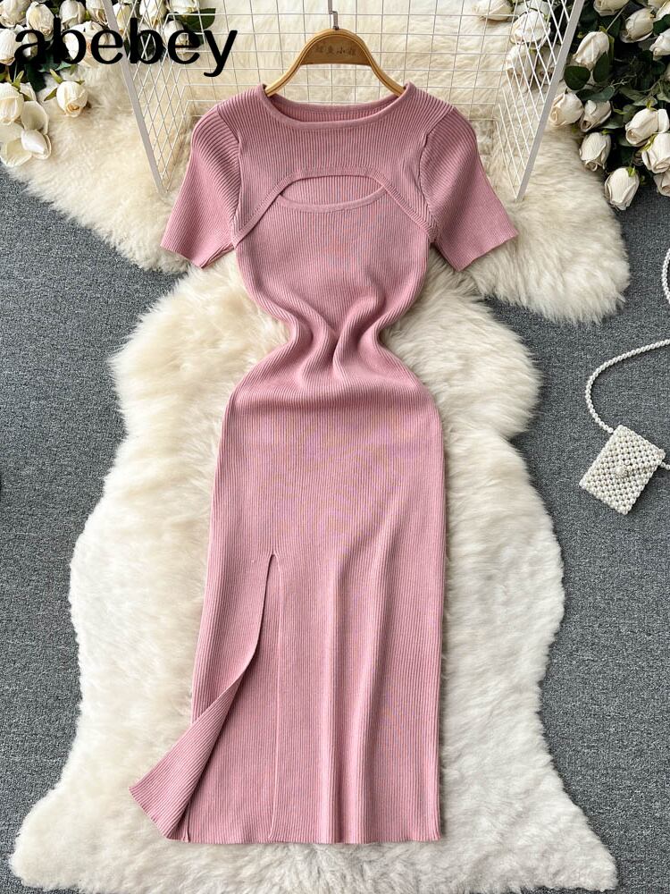 女性の夏のニットドレス 2022 o ネックストリートスリムミディショートサンドレス弾性ウエストセクシーなボディコンドレス エラスティック 伸縮 サマー 夏物 Oネック Abe51301090041