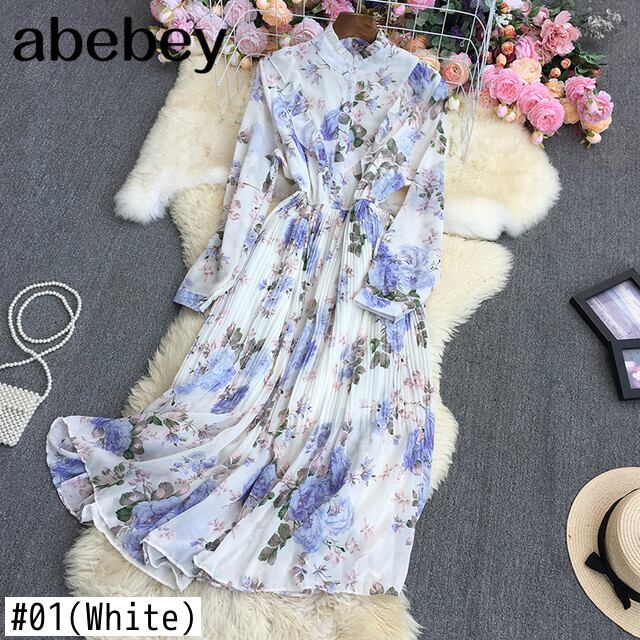 2022 春秋スタンドカラー長袖ドレスフリルシングルブレストハイウエストプリントロングプリーツドレス ハイウェスト ラッフル スプリング 春物 オータム 秋物 Abe4997555614