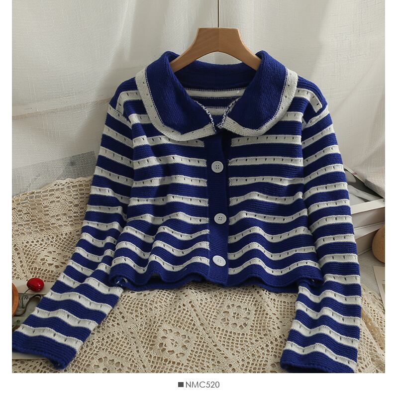 スウィートピーターパンカラーストライプボタンカーディガンセーター長袖ニットセーターかわいいルーズ女性トップ ロング 大人ガーリー キュート カジュアル Abe54281325802