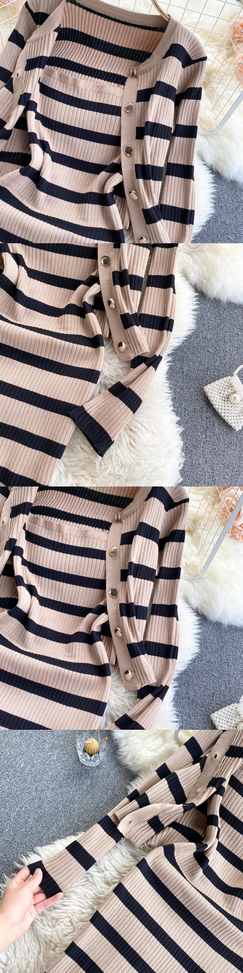 スタイルストライプネック長袖カーディガントップスリム痩身サスペンダードレス女性スーツ ロング Abe74854324968