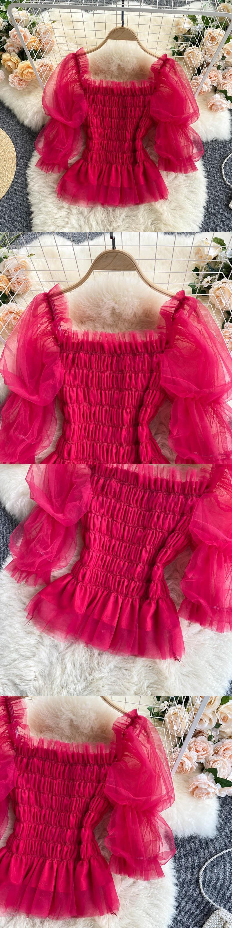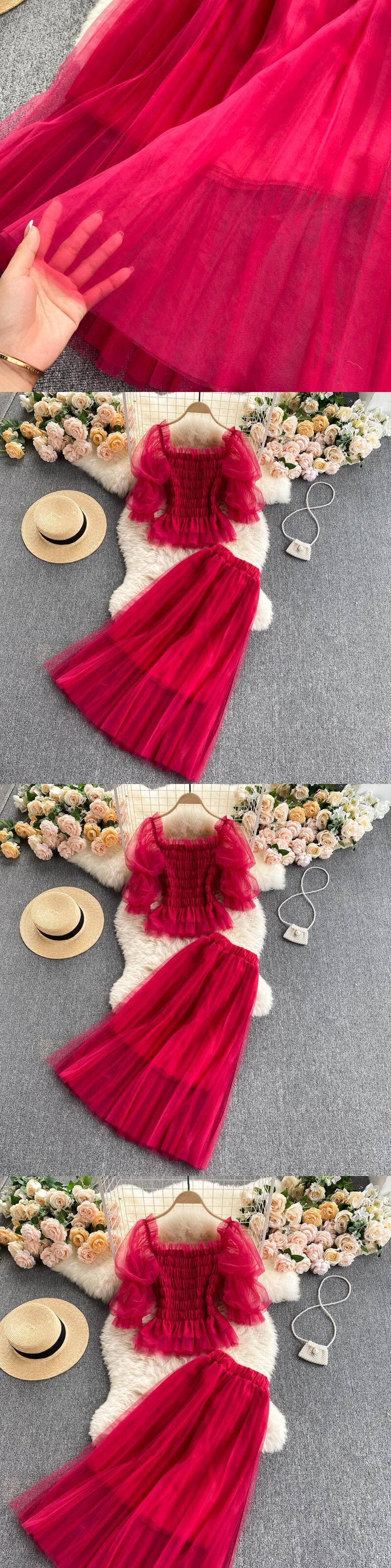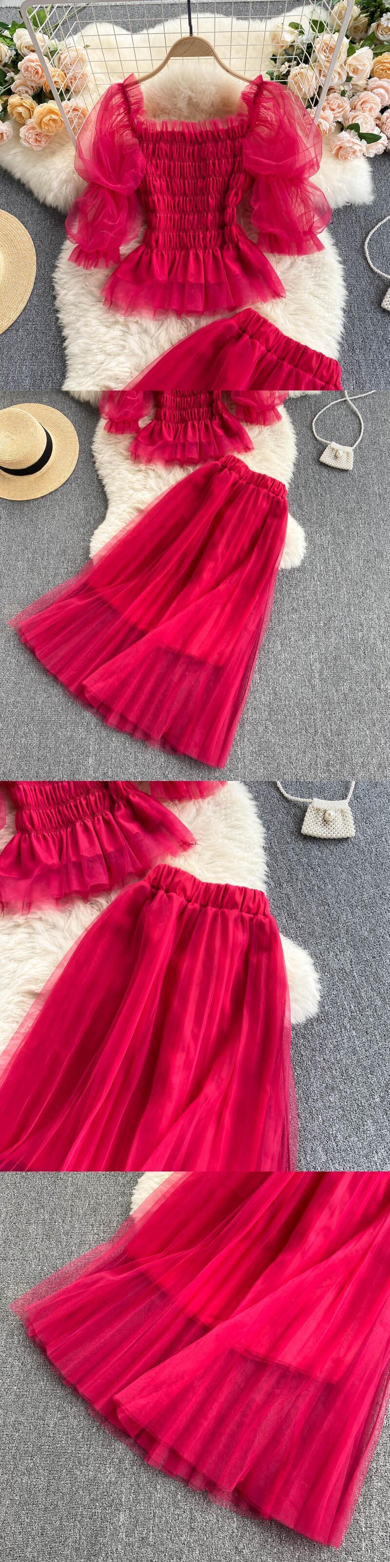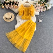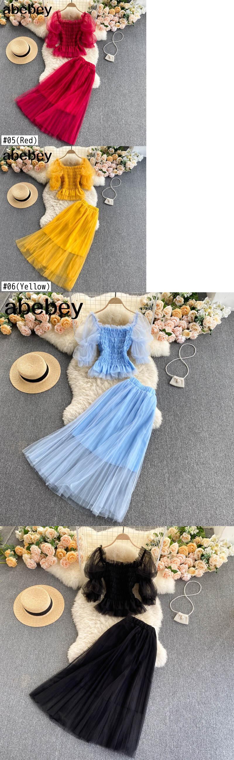女性夏自由奔放に生きるメッシュビーチセットセクシーな背中の開いたパフスリーブショートトップス + ウエストロングスカートツーピーススーツ サマー 夏物 Abe17389851865