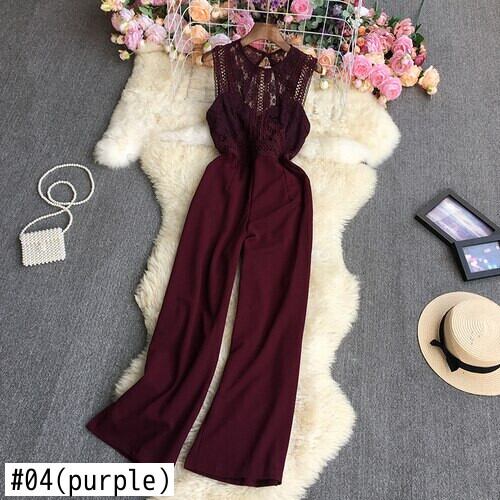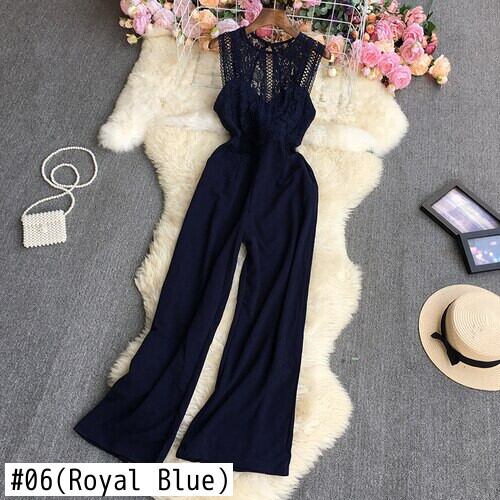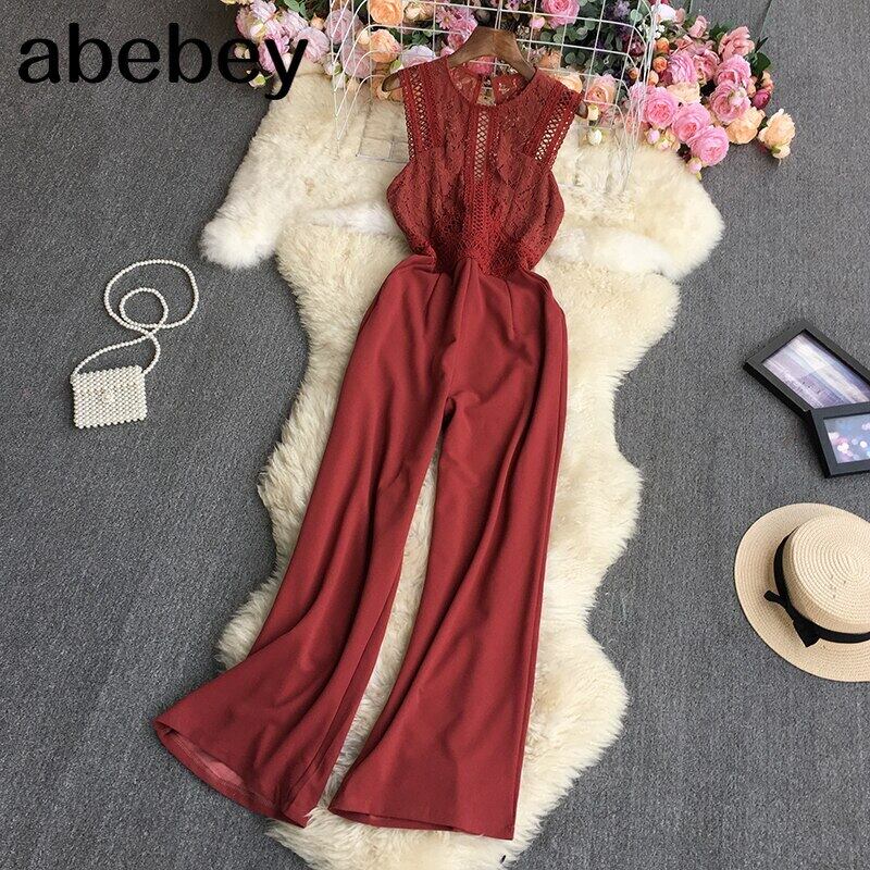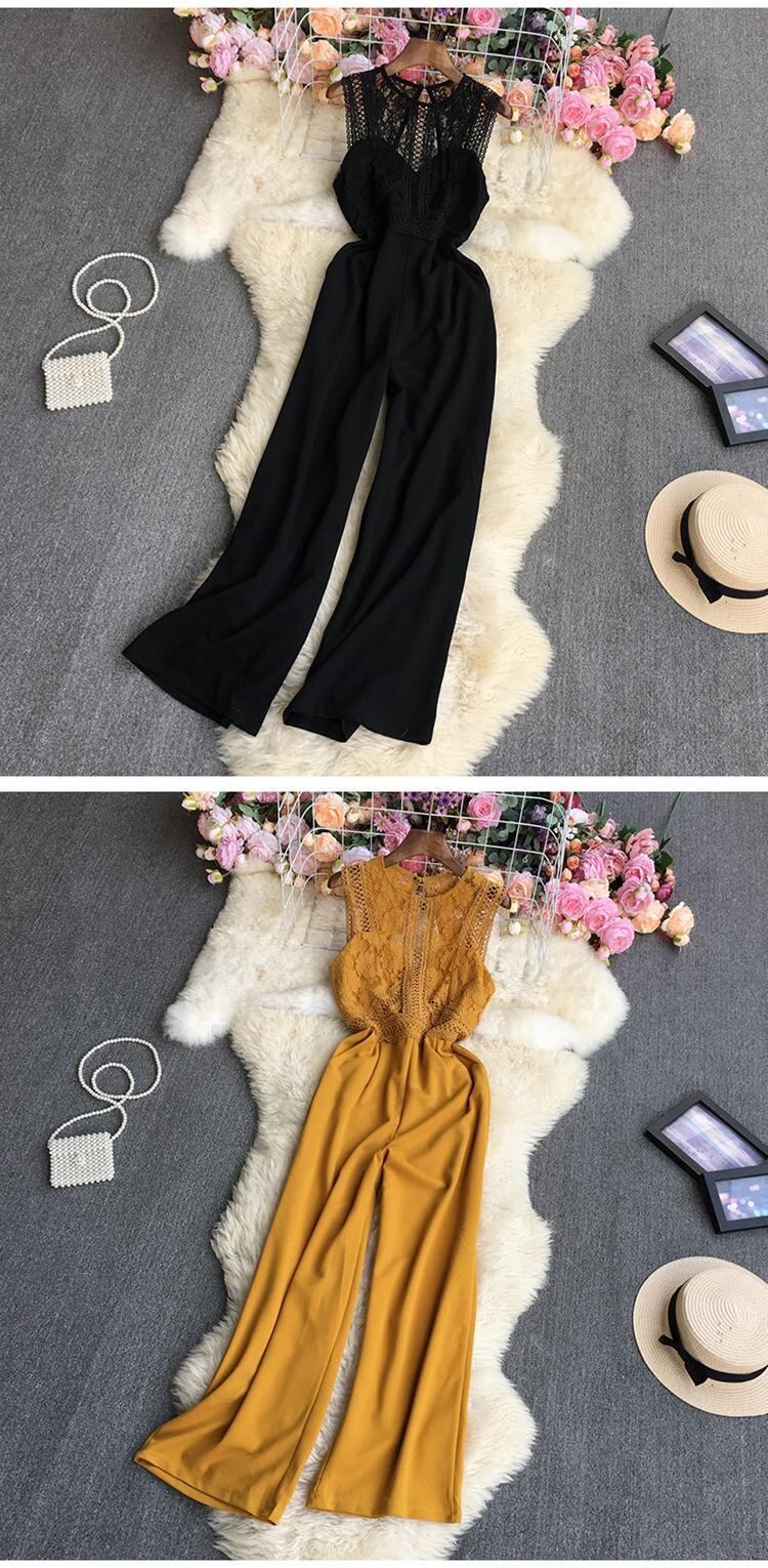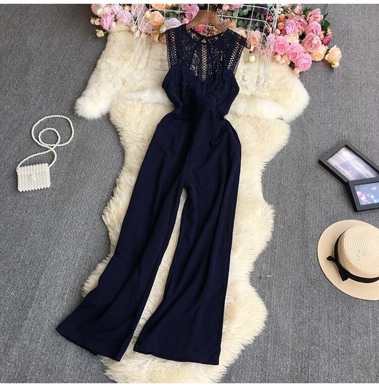 2022 春秋 O ネックノースリーブジャンプスーツ中空アウトフックレースパッチワークハイウエストカジュアルワイドレッグジャンプスーツ ハイウェスト スプリング 春物 オータム 秋物 Oネック ワイドパンツ Abe58586620358