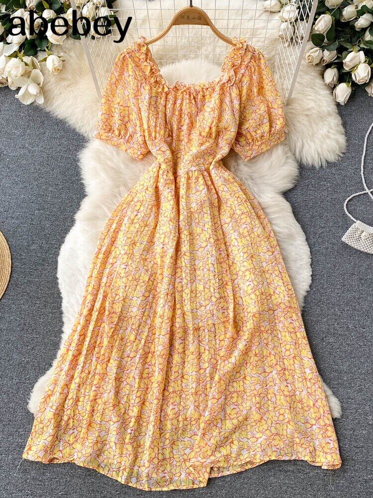 甘い花ドレス女性グリーンスクエアカラー半袖 A ラインドレス夏ボヘミアンプリントビーチサンドレス ショート ハーフスリーブ 大人ガーリー スウィート キュート カジュアル サマー 夏物 花柄 Aライン スクウェア Abe16747683456