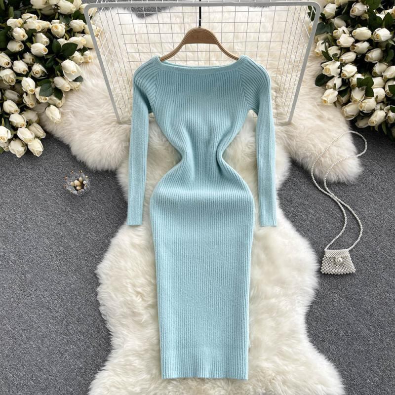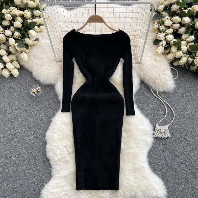 ニットドレス弾性スリム長袖ペンシルドレス秋冬厚く暖かいストリートセータードレス ロング エラスティック 伸縮 オータム 秋物 ウィンター 冬物 Abe87867544537