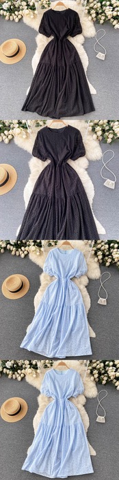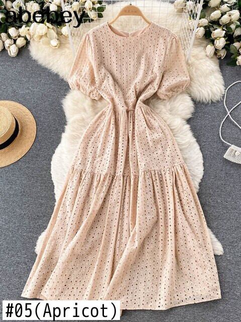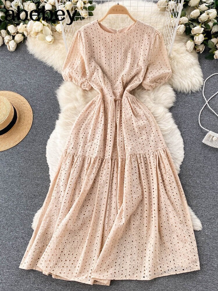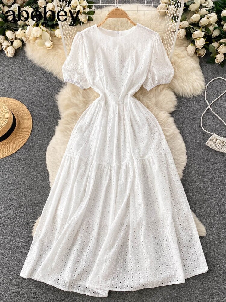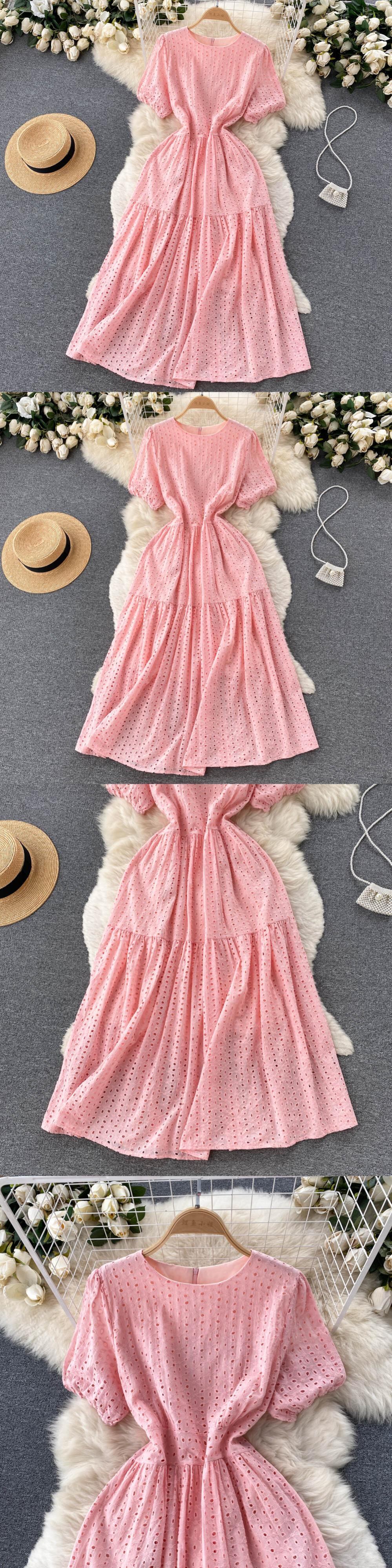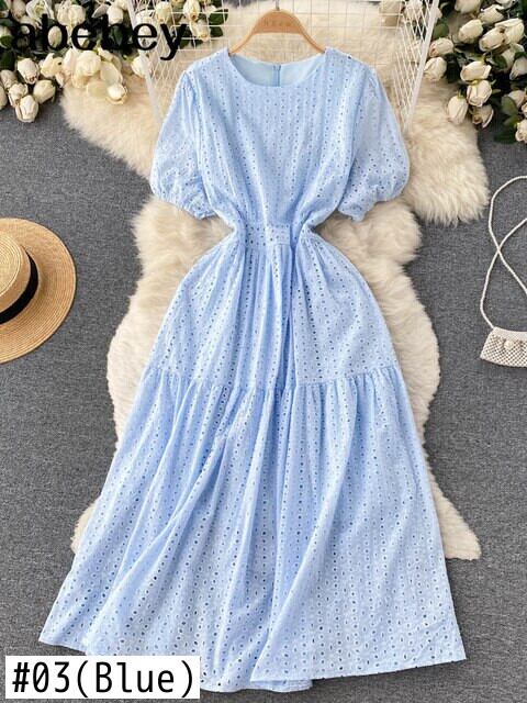 女性ブルー/ピンク/ホワイト中空アウト マキシ ロング ドレス o ネック パフ半袖ウエスト パーティー ローブ Vestido ショート ハーフスリーブ Oネック Abe69022886796
