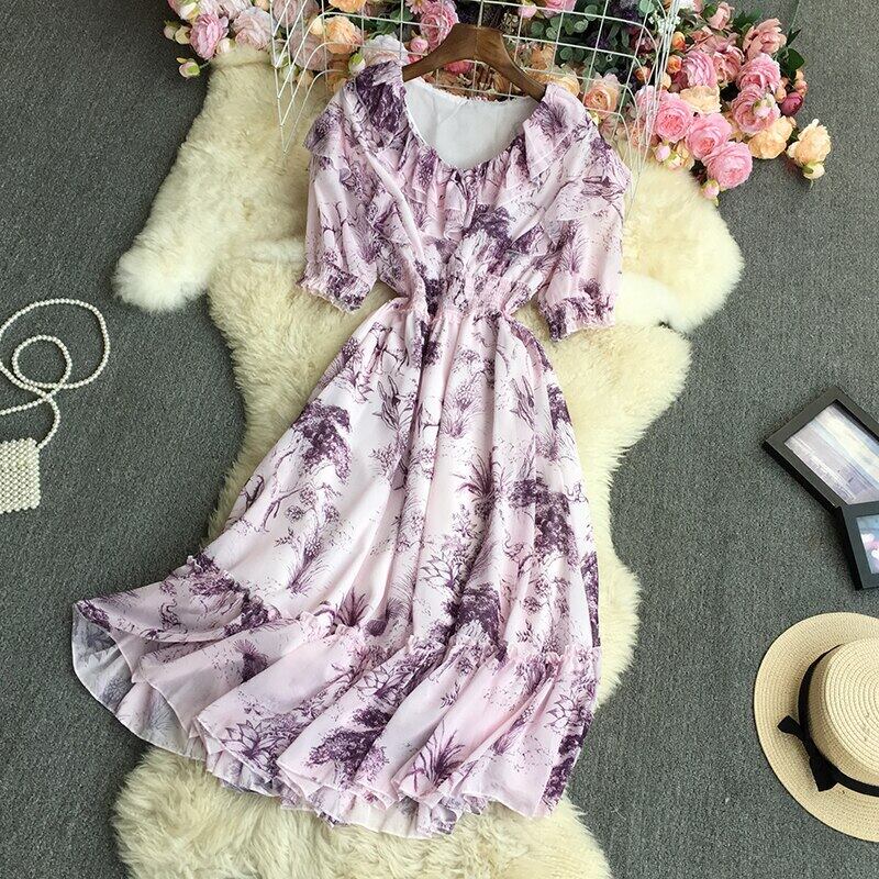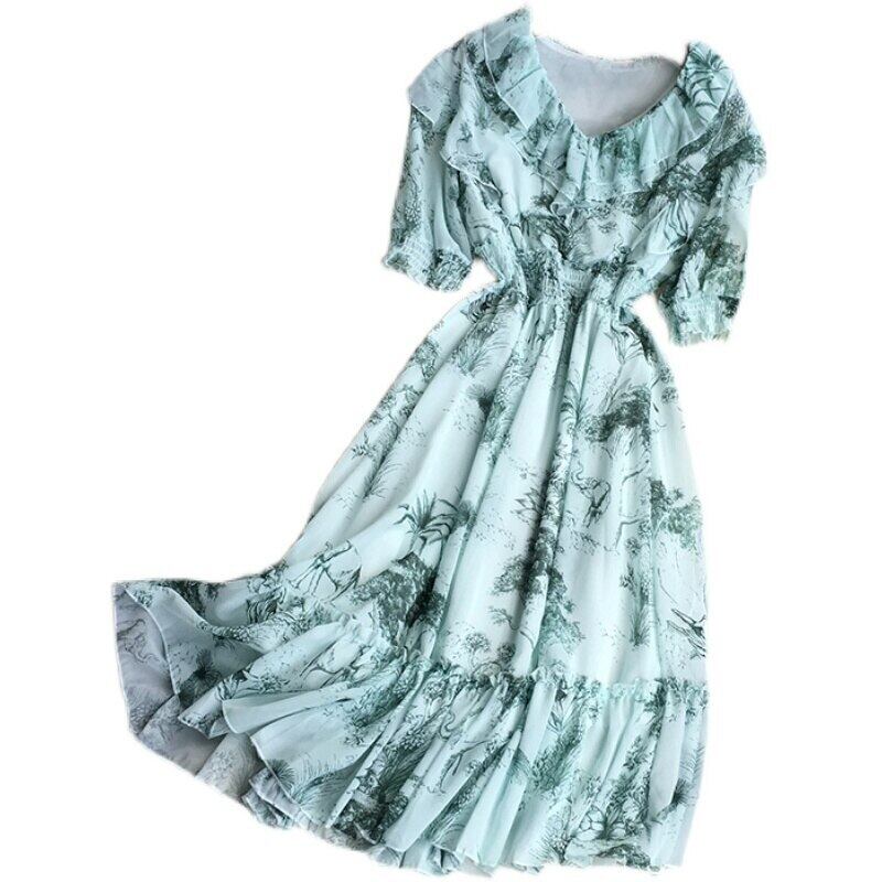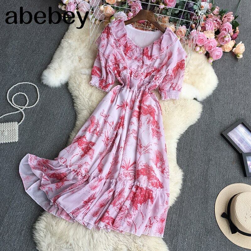 2022 春秋の V ネック半袖ドレスタイダイプリントフリルパッチワークハイウエストミッドレングス A ラインドレス ハイウェスト ショート ハーフスリーブ ラッフル スプリング 春物 オータム 秋物 Vネック Aライン Abe6423140160