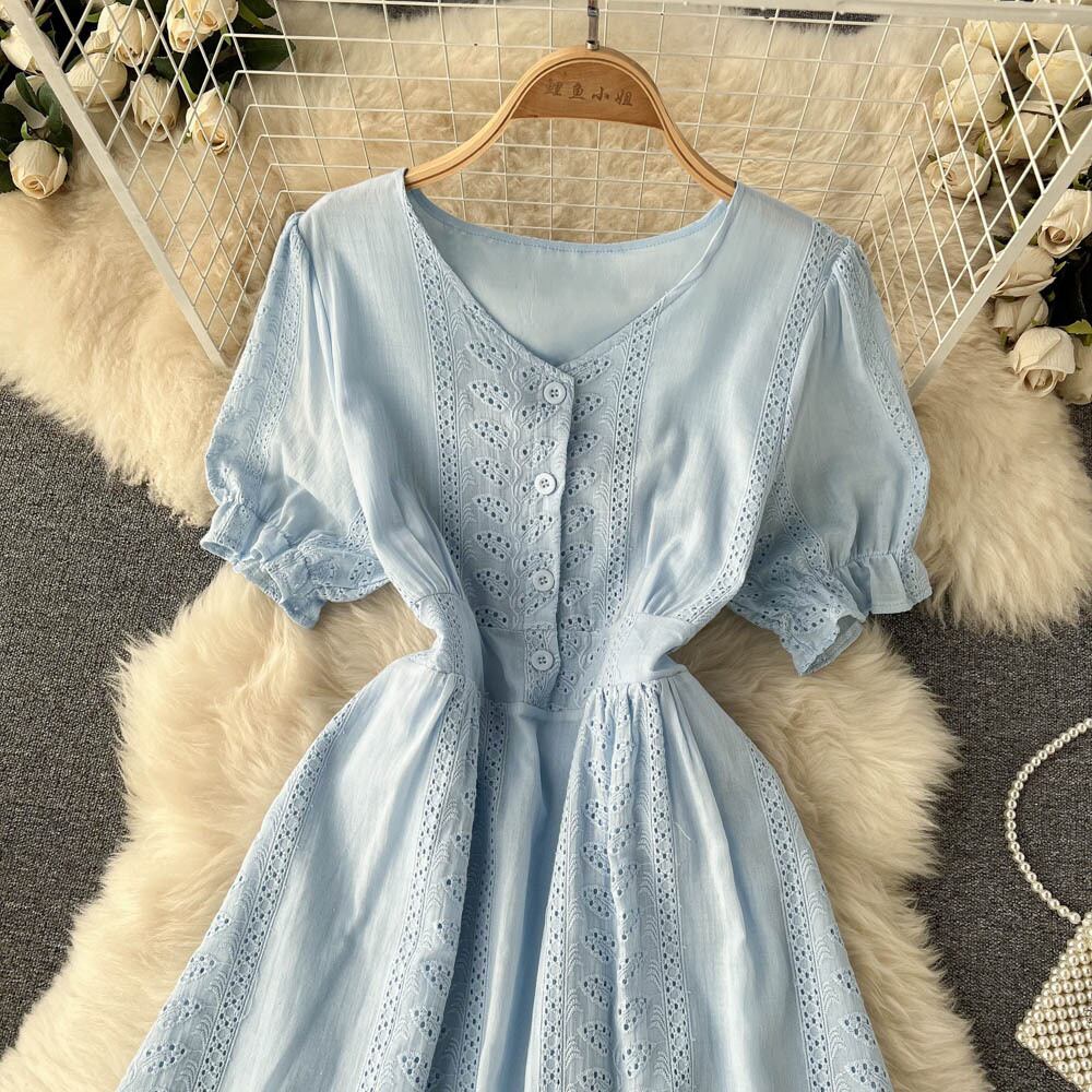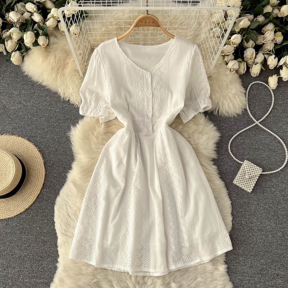 2022 サマードレス女性スウィートパフスリーブ V ネック中空アウト A ラインドレスソリッドショートサンドレス 大人ガーリー キュート カジュアル 夏物 Vネック Aライン ソリッドカラー Abe37381598849