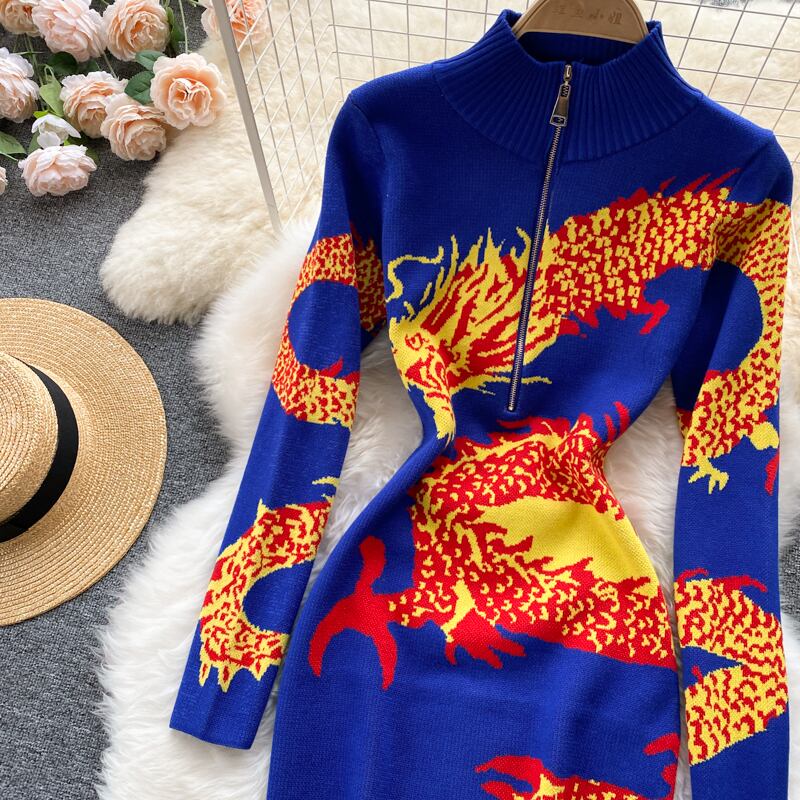 女性のレトロなプリントニットドレスジッパースタンドカラー長袖スリムドレス秋冬暖かいセータードレス ロング オータム 秋物 ウィンター 冬物 Abe72855993119