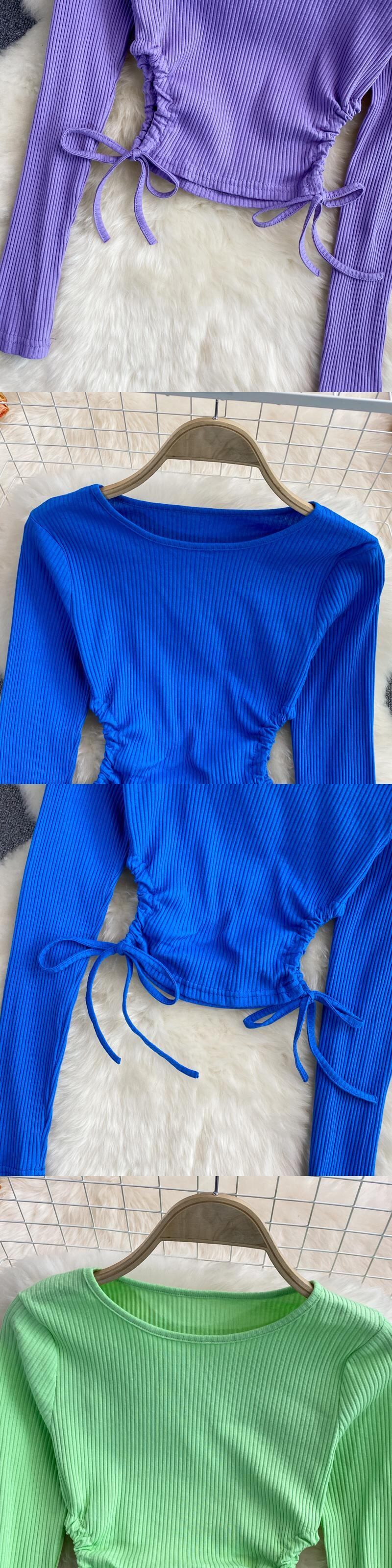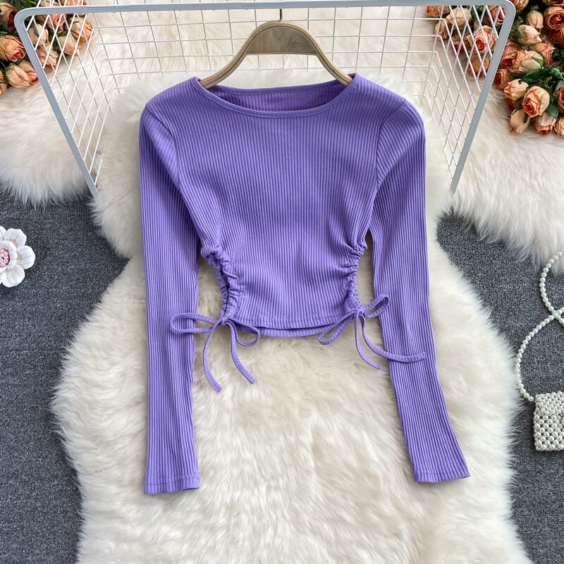 女性ブラウス中空ウエスト長袖 O ネックスリムトップス秋のシックなストリートショートブラウス 2022 ロング オータム 秋物 Oネック Abe15547244782